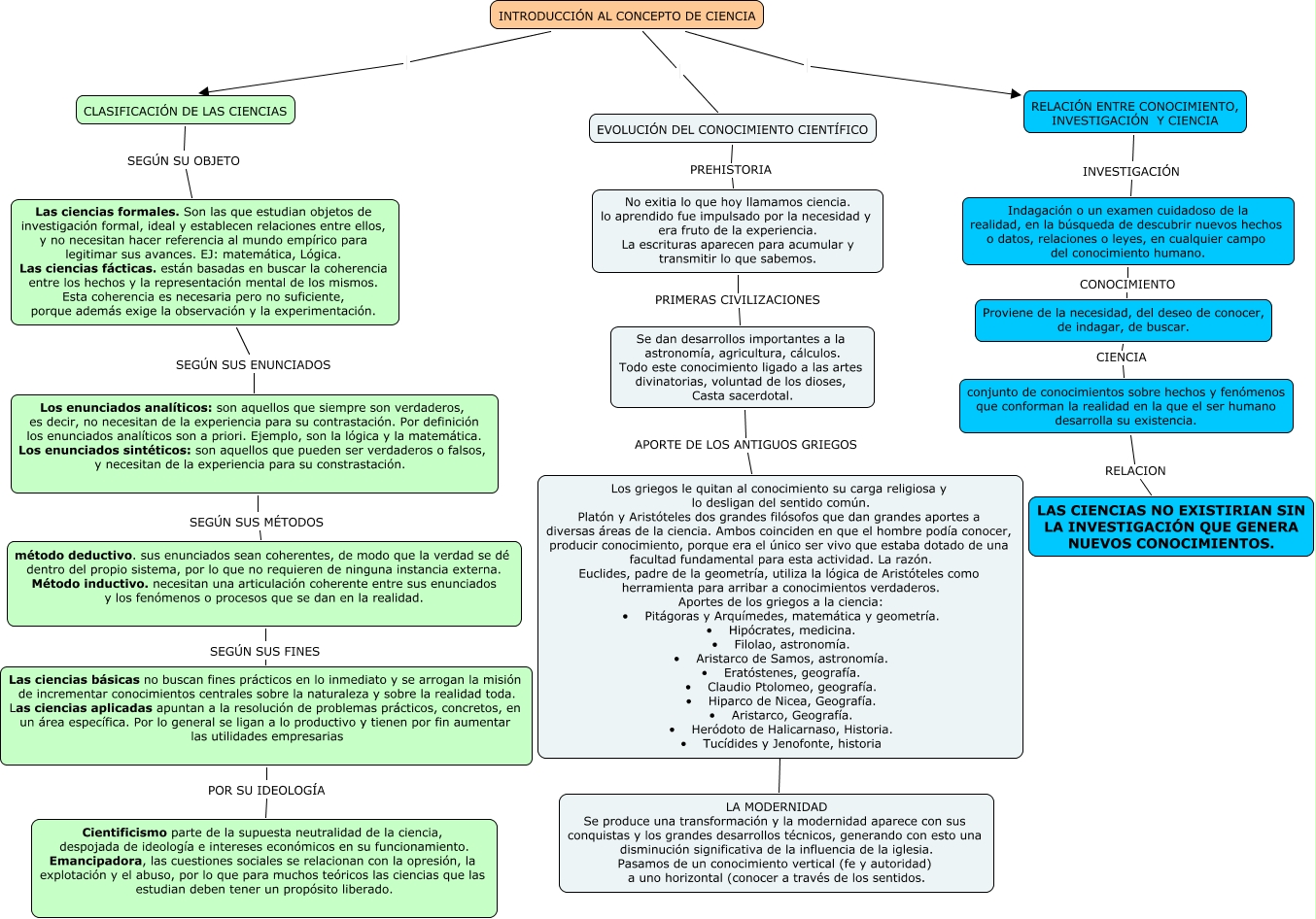 Este Cmap, tiene información relacionada con: INTRODUCCIÓN AL CONCEPTO DE CIENCIA, INTRODUCCIÓN AL CONCEPTO DE CIENCIA CLASIFICACIÓN DE LAS CIENCIAS, No exitia lo que hoy llamamos ciencia. lo aprendido fue impulsado por la necesidad y era fruto de la experiencia. La escrituras aparecen para acumular y transmitir lo que sabemos. PRIMERAS CIVILIZACIONES Se dan desarrollos importantes a la astronomía, agricultura, cálculos. Todo este conocimiento ligado a las artes divinatorias, voluntad de los dioses, Casta sacerdotal., Indagación o un examen cuidadoso de la realidad, en la búsqueda de descubrir nuevos hechos o datos, relaciones o leyes, en cualquier campo del conocimiento humano. CONOCIMIENTO Proviene de la necesidad, del deseo de conocer, de indagar, de buscar., conjunto de conocimientos sobre hechos y fenómenos que conforman la realidad en la que el ser humano desarrolla su existencia. RELACION LAS CIENCIAS NO EXISTIRIAN SIN LA INVESTIGACIÓN QUE GENERA NUEVOS CONOCIMIENTOS., INTRODUCCIÓN AL CONCEPTO DE CIENCIA RELACIÓN ENTRE CONOCIMIENTO, INVESTIGACIÓN Y CIENCIA, Los enunciados analíticos: son aquellos que siempre son verdaderos, es decir, no necesitan de la experiencia para su contrastación. Por definición los enunciados analíticos son a priori. Ejemplo, son la lógica y la matemática. Los enunciados sintéticos: son aquellos que pueden ser verdaderos o falsos, y necesitan de la experiencia para su constrastación. SEGÚN SUS MÉTODOS método deductivo. sus enunciados sean coherentes, de modo que la verdad se dé dentro del propio sistema, por lo que no requieren de ninguna instancia externa. Método inductivo. necesitan una articulación coherente entre sus enunciados y los fenómenos o procesos que se dan en la realidad., método deductivo. sus enunciados sean coherentes, de modo que la verdad se dé dentro del propio sistema, por lo que no requieren de ninguna instancia externa. Método inductivo. necesitan una articulación coherente entre sus enunciados y los fenómenos o procesos que se dan en la realidad. SEGÚN SUS FINES Las ciencias básicas no buscan fines prácticos en lo inmediato y se arrogan la misión de incrementar conocimientos centrales sobre la naturaleza y sobre la realidad toda. Las ciencias aplicadas apuntan a la resolución de problemas prácticos, concretos, en un área específica. Por lo general se ligan a lo productivo y tienen por fin aumentar las utilidades empresarias, Los griegos le quitan al conocimiento su carga religiosa y lo desligan del sentido común. Platón y Aristóteles dos grandes filósofos que dan grandes aportes a diversas áreas de la ciencia. Ambos coinciden en que el hombre podía conocer, producir conocimiento, porque era el único ser vivo que estaba dotado de una facultad fundamental para esta actividad. La razón. Euclides, padre de la geometría, utiliza la lógica de Aristóteles como herramienta para arribar a conocimientos verdaderos. Aportes de los griegos a la ciencia: • Pitágoras y Arquímedes, matemática y geometría. • Hipócrates, medicina. • Filolao, astronomía. • Aristarco de Samos, astronomía. • Eratóstenes, geografía. • Claudio Ptolomeo, geografía. • Hiparco de Nicea, Geografía. • Aristarco, Geografía. • Heródoto de Halicarnaso, Historia. • Tucídides y Jenofonte, historia ???? LA MODERNIDAD Se produce una transformación y la modernidad aparece con sus conquistas y los grandes desarrollos técnicos, generando con esto una disminución significativa de la influencia de la iglesia. Pasamos de un conocimiento vertical (fe y autoridad) a uno horizontal (conocer a través de los sentidos., Las ciencias formales. Son las que estudian objetos de investigación formal, ideal y establecen relaciones entre ellos, y no necesitan hacer referencia al mundo empírico para legitimar sus avances. EJ: matemática, Lógica. Las ciencias fácticas. están basadas en buscar la coherencia entre los hechos y la representación mental de los mismos. Esta coherencia es necesaria pero no suficiente, porque además exige la observación y la experimentación. SEGÚN SUS ENUNCIADOS Los enunciados analíticos: son aquellos que siempre son verdaderos, es decir, no necesitan de la experiencia para su contrastación. Por definición los enunciados analíticos son a priori. Ejemplo, son la lógica y la matemática. Los enunciados sintéticos: son aquellos que pueden ser verdaderos o falsos, y necesitan de la experiencia para su constrastación., CLASIFICACIÓN DE LAS CIENCIAS SEGÚN SU OBJETO Las ciencias formales. Son las que estudian objetos de investigación formal, ideal y establecen relaciones entre ellos, y no necesitan hacer referencia al mundo empírico para legitimar sus avances. EJ: matemática, Lógica. Las ciencias fácticas. están basadas en buscar la coherencia entre los hechos y la representación mental de los mismos. Esta coherencia es necesaria pero no suficiente, porque además exige la observación y la experimentación., Se dan desarrollos importantes a la astronomía, agricultura, cálculos. Todo este conocimiento ligado a las artes divinatorias, voluntad de los dioses, Casta sacerdotal. APORTE DE LOS ANTIGUOS GRIEGOS Los griegos le quitan al conocimiento su carga religiosa y lo desligan del sentido común. Platón y Aristóteles dos grandes filósofos que dan grandes aportes a diversas áreas de la ciencia. Ambos coinciden en que el hombre podía conocer, producir conocimiento, porque era el único ser vivo que estaba dotado de una facultad fundamental para esta actividad. La razón. Euclides, padre de la geometría, utiliza la lógica de Aristóteles como herramienta para arribar a conocimientos verdaderos. Aportes de los griegos a la ciencia: • Pitágoras y Arquímedes, matemática y geometría. • Hipócrates, medicina. • Filolao, astronomía. • Aristarco de Samos, astronomía. • Eratóstenes, geografía. • Claudio Ptolomeo, geografía. • Hiparco de Nicea, Geograf