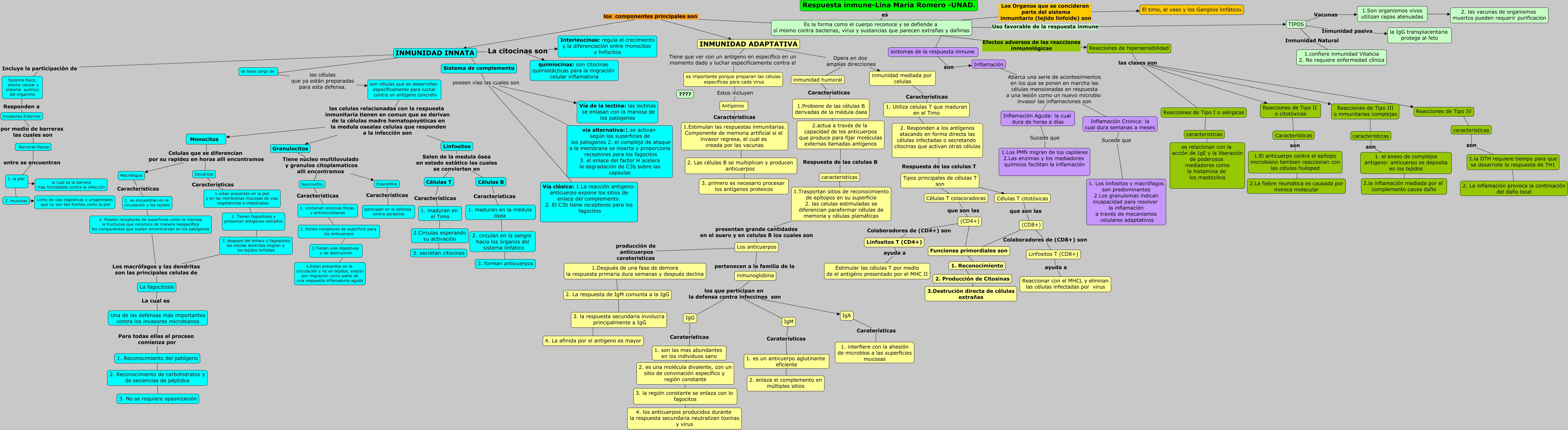 Este Cmap, tiene información relacionada con: respuesta inmune, Reacciones de hipersensibilidad las clases son Reacciones de Tipo IV, características son 1.la DTH requiere tiempo para que se desarrolle la respuesta de TH1, 1. maduran en la médula ósea ???? 2. circulan en la sangre hacia los órganos del sistema linfatico, Neutroófilo Características 1. contienen enzimas líticas y antimicrobianas, Células T citotóxicas que son las (CD8+), Inflamación Cronica: la cual dura semanas a meses Sucede que 1. Los linfositos y macrófagos son predominantes 2.Los granulomas indican incapacidad para resolver la inflamación a través de mecanismos celulares adaptativos, 2.actua a través de la capacidad de los anticuerpos que produce para fijar moléculas externas llamadas antígenos Respuesta de las celulas B caracteristicas, Inflamación Abarca una serie de acontesimientos en los que se ponen en marcha las células mensionadas en respuesta a una lesión como un nuevo microbio invasor las inflamaciones son Inflamación Aguda: la cual dura de horas a días, Sistema de complemento poseen vías las cuales son Vía de la lectina: las lectinas se enlasan con la manosa de los patogenos, Reacciones de Tipo III o inmunitarias complejas ???? características, 1.Trasportan sitios de reconocimiento de epítopos en su superficie 2. las celulas estimuladas se diferencian paraformar células de memoria y células plamáticas presentan grande cantidades en el suero y en celulas B los cuales son Los anticuerpos, Reacciones de hipersensibilidad las clases son Reacciones de Tipo I o alérgicas, son células que se desarrollan específicamente para luchar contra un antígeno concreto las celulas relacionadas con la respuesta inmunitaria tienen en comun que se derivan de la células madre hematopoyéticas en la medula osealas celulas que responden a la infección son Linfositos, 2. Reconocimiento de carbohidratos y de seciencias de péptidos ???? 3. No se requiere opsonización, 1. Reconocimiento del patógeno ???? 2. Reconocimiento de carbohidratos y de seciencias de péptidos, 2. Tienen fagositosis y presentan antigenos extraños ???? 3. despues del enlace y fagositosis las celulas dentritas migran a los tejidos linfoides, Células T Características 1. maduran en el Timo, (CD4+) Colaboradores de (CD4+) son Linfositos T (CD4+), Los anticuerpos pertenecen a la familia de la inmunoglobina, Linfositos T (CD4+) ayuda a Estimular las células T por medio de el antigéno presentado por el MHC II