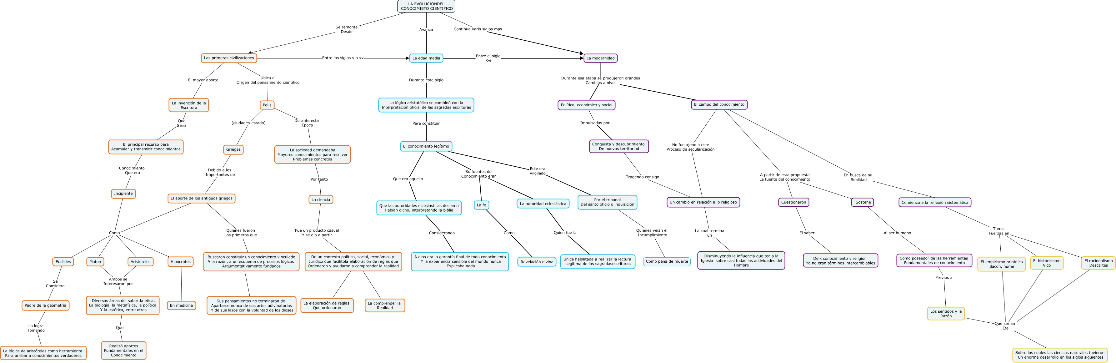 Este Cmap, tiene información relacionada con: EVOLUCION, El campo del conocimiento A partir de esta propuesta La fuente del conocimiento, Cuestionaron, El conocimiento legítimo Que era aquello Que las autoridades eclesiásticas decían o Habían dicho, interpretando la biblia, Incipiente Como Platon, La sociedad demandaba Mayores conocimientos para resolver Problemas concretos Por tanto La ciencia, La edad media Durante este siglo La lógica aristotélica se combinó con la Interpretación oficial de las sagradas escrituras, Platon Ambos se Interesaron por Diversas áreas del saber:la ética, La biología, la metafísica, la política Y la estética, entre otras, El conocimiento legítimo Su fuentes del Conocimiento eran La autoridad eclesiástica, Polis Durante esta Epoca La sociedad demandaba Mayores conocimientos para resolver Problemas concretos, La ciencia Fue un producto casual Y se dio a partir De un contexto político, social, económico y Jurídico que facilitóla elaboración de reglas que Ordenaron y ayudaron a comprender la realidad, La edad media Entre el siglo Xvi La modernidad, Incipiente Como Aristoteles, La autoridad eclesiástica Quien fue la Unica habilitada a realizar la lectura Legítima de las sagradasescrituras, El conocimiento legítimo Este era Vilgilado Por el tribunal Del santo oficio o inquisición, Las primeras civilizaciones Ubica el Origen del pensamiento científico Polis, Como poseedor de las herramientas Fundamentales de conocimiento Previos a Los sentidos y la Razón, El campo del conocimiento A partir de esta propuesta La fuente del conocimiento, Sostene, Diversas áreas del saber:la ética, La biología, la metafísica, la política Y la estética, entre otras Que Realizó aportes Fundamentales en el Conocimiento, El conocimiento legítimo Su fuentes del Conocimiento eran La fe, El principal recurso para Acumular y transmitir conocimientos Conocimiento Que era Incipiente, El campo del conocimiento No fue ajeno a este Proceso de secularización Un cambio en relación a lo religioso