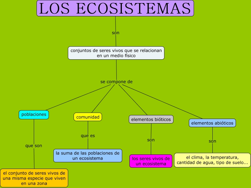 Este Cmap, tiene información relacionada con: Los ecosistemas, comunidad que es la suma de las poblaciones de un ecosistema, conjuntos de seres vivos que se relacionan en un medio físico se compone de elementos abióticos, poblaciones que son el conjunto de seres vivos de una misma especie que viven en una zona, conjuntos de seres vivos que se relacionan en un medio físico se compone de elementos bióticos, LOS ECOSISTEMAS son conjuntos de seres vivos que se relacionan en un medio físico, elementos bióticos son los seres vivos de un ecosistema, conjuntos de seres vivos que se relacionan en un medio físico se compone de poblaciones, elementos abióticos son el clima, la temperatura, cantidad de agua, tipo de suelo..., conjuntos de seres vivos que se relacionan en un medio físico se compone de comunidad