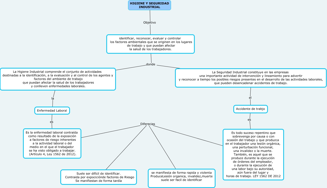 Este Cmap, tiene información relacionada con: Higiene y seguridad (3).cmap, identificar, reconocer, evaluar y controlar los factores ambientales que se originen en los lugares de trabajo y que puedan afectar la salud de los trabajadores. donde La Higiene Industrial comprende el conjunto de actividades destinadas a la identificación, a la evaluación y al control de los agentes y factores del ambiente de trabajo que puedan afectar la salud de los trabajadores y conlleven enfermedades laborales., Accidente de trabjo el La Seguridad Industrial constituye en las empresas una importante actividad de intervención y lineamiento para advertir y reconocer a tiempo los posibles riesgos presentes en el desarrollo de las actividades laborales, que pueden desencadenar accidentes de trabajo., Es la enfermedad laboral contraída como resultado de la exposición a factores de riesgo inherentes a la actividad laboral o del medio en el que el trabajador se ha visto obligado a trabajar. (Artículo 4, Ley 1562 de 2012). Diferecias Es todo suceso repentino que sobrevenga por causa o con ocasión del trabajo y que produzca en el trabajador una lesión orgánica, una perturbación funcional, una invalidez o la muerte. También, es aquel que se produce durante la ejecución de órdenes del empleador, o durante la ejecución de una labor bajo su autoridad, aún fuera del lugar y horas de trabajo. LEY 1562 DE 2012, Enfermedad Laboral la La Higiene Industrial comprende el conjunto de actividades destinadas a la identificación, a la evaluación y al control de los agentes y factores del ambiente de trabajo que puedan afectar la salud de los trabajadores y conlleven enfermedades laborales., Accidente de trabjo es Es todo suceso repentino que sobrevenga por causa o con ocasión del trabajo y que produzca en el trabajador una lesión orgánica, una perturbación funcional, una invalidez o la muerte. También, es aquel que se produce durante la ejecución de órdenes del empleador, o durante la ejecución de una labor bajo su autoridad, aún fuera del lugar y horas de trabajo. LEY 1562 DE 2012, Enfermedad Laboral es Es la enfermedad laboral contraída como resultado de la exposición a factores de riesgo inherentes a la actividad laboral o del medio en el que el trabajador se ha visto obligado a trabajar. (Artículo 4, Ley 1562 de 2012)., Es la enfermedad laboral contraída como resultado de la exposición a factores de riesgo inherentes a la actividad laboral o del medio en el que el trabajador se ha visto obligado a trabajar. (Artículo 4, Ley 1562 de 2012). Diferecias Suele ser difícil de identificar. Contraida por expociciónde factores de Riesgo Se manifiestan de forma tardía, Es la enfermedad laboral contraída como resultado de la exposición a factores de riesgo inherentes a la actividad laboral o del medio en el que el trabajador se ha visto obligado a trabajar. (Artículo 4, Ley 1562 de 2012). Diferecias se manifiesta de forma rapida y violenta ProduceLesión organica, invalidez,muerte suele ser facil de identificar, identificar, reconocer, evaluar y controlar los factores ambientales que se originen en los lugares de trabajo y que puedan afectar la salud de los trabajadores. donde La Seguridad Industrial constituye en las empresas una importante actividad de intervención y lineamiento para advertir y reconocer a tiempo los posibles riesgos presentes en el desarrollo de las actividades laborales, que pueden desencadenar accidentes de trabajo., HIGIENE Y SEGURIDAD INDUSTRIAL Objetivo identificar, reconocer, evaluar y controlar los factores ambientales que se originen en los lugares de trabajo y que puedan afectar la salud de los trabajadores.