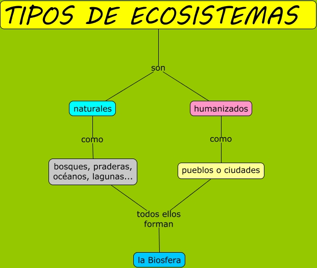 Este Cmap, tiene información relacionada con: Tipos de ecosistemas, humanizados como pueblos o ciudades, naturales como bosques, praderas, océanos, lagunas..., pueblos o ciudades todos ellos forman la Biosfera, TIPOS DE ECOSISTEMAS son naturales, bosques, praderas, océanos, lagunas... todos ellos forman la Biosfera, TIPOS DE ECOSISTEMAS son humanizados