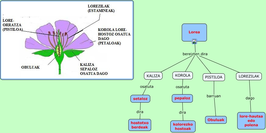 IHMC CmapTools-ekin sortu den kontzeptu-mapa honek honi buruzko informazioa du: FLOR_Partes, KALIZA osatuta setaloz, Lorea bereizten dira LOREZILAK, Lorea bereizten dira PISTILOA, pepaloz dira kolorezko hostoak, LOREZILAK dago lore-hautsa edo polena, Lorea bereizten dira KALIZA, setaloz dira hostotxo berdeak, Lorea bereizten dira KOROLA, KOROLA osatuta pepaloz, PISTILOA barruan Obuluak