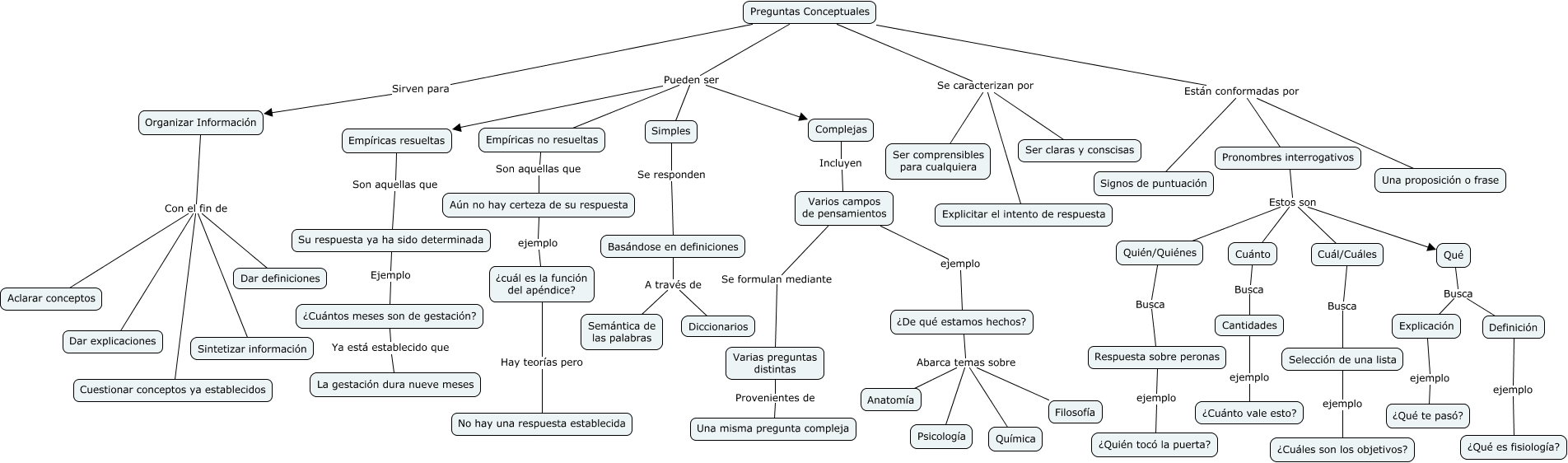 Este Cmap, tiene información relacionada con: Preguntas Conceptuales, Pronombres interrogativos Estos son Quién/Quiénes, Varios campos de pensamientos ejemplo ¿De qué estamos hechos?, Organizar Información Con el fin de Dar explicaciones, Empíricas no resueltas Son aquellas que Aún no hay certeza de su respuesta, Complejas Incluyen Varios campos de pensamientos, Preguntas Conceptuales Sirven para Organizar Información, Aún no hay certeza de su respuesta ejemplo ¿cuál es la función del apéndice?, Organizar Información Con el fin de Dar definiciones, ¿De qué estamos hechos? Abarca temas sobre Química, Pronombres interrogativos Estos son Cuánto, Varios campos de pensamientos Se formulan mediante Varias preguntas distintas, Preguntas Conceptuales Se caracterizan por Ser comprensibles para cualquiera, Qué Busca Explicación, ¿De qué estamos hechos? Abarca temas sobre Psicología, Preguntas Conceptuales Están conformadas por Signos de puntuación, Respuesta sobre peronas ejemplo ¿Quién tocó la puerta?, Cuánto Busca Cantidades, Qué Busca Definición, Selección de una lista ejemplo ¿Cuáles son los objetivos?, Preguntas Conceptuales Pueden ser Empíricas resueltas