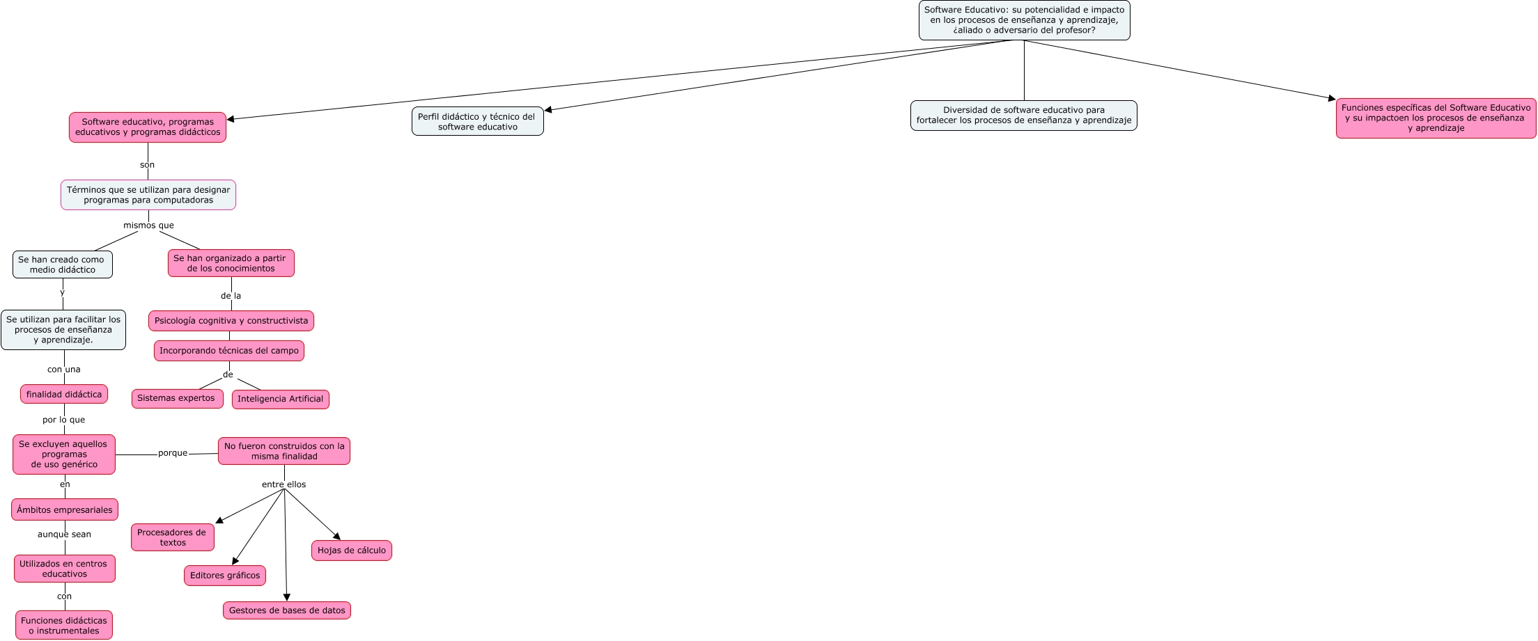 Este Cmap, tiene información relacionada con: Software educativo, finalidad didáctica por lo que Se excluyen aquellos programas de uso genérico, Utilizados en centros educativos con Funciones didácticas o instrumentales, Términos que se utilizan para designar programas para computadoras mismos que Se han organizado a partir de los conocimientos, Software educativo, programas educativos y programas didácticos son Términos que se utilizan para designar programas para computadoras, Se excluyen aquellos programas de uso genérico porque No fueron construidos con la misma finalidad, Términos que se utilizan para designar programas para computadoras mismos que Se han creado como medio didáctico, Incorporando técnicas del campo de Sistemas expertos, Software Educativo: su potencialidad e impacto en los procesos de enseñanza y aprendizaje, ¿aliado o adversario del profesor? ???? Diversidad de software educativo para fortalecer los procesos de enseñanza y aprendizaje, Se excluyen aquellos programas de uso genérico en Ámbitos empresariales, No fueron construidos con la misma finalidad entre ellos Procesadores de textos, Software Educativo: su potencialidad e impacto en los procesos de enseñanza y aprendizaje, ¿aliado o adversario del profesor? ???? Software educativo, programas educativos y programas didácticos, Software Educativo: su potencialidad e impacto en los procesos de enseñanza y aprendizaje, ¿aliado o adversario del profesor? ???? Funciones específicas del Software Educativo y su impactoen los procesos de enseñanza y aprendizaje, Se han organizado a partir de los conocimientos de la Psicología cognitiva y constructivista, Se han creado como medio didáctico y Se utilizan para facilitar los procesos de enseñanza y aprendizaje., No fueron construidos con la misma finalidad entre ellos Hojas de cálculo, No fueron construidos con la misma finalidad entre ellos Editores gráficos, Software Educativo: su potencialidad e impacto en los procesos de enseñanza y aprendizaje, ¿aliado o adversario del profesor? ???? Perfil didáctico y técnico del software educativo, Incorporando técnicas del campo de Inteligencia Artificial, Psicología cognitiva y constructivista ???? Incorporando técnicas del campo, No fueron construidos con la misma finalidad entre ellos Gestores de bases de datos