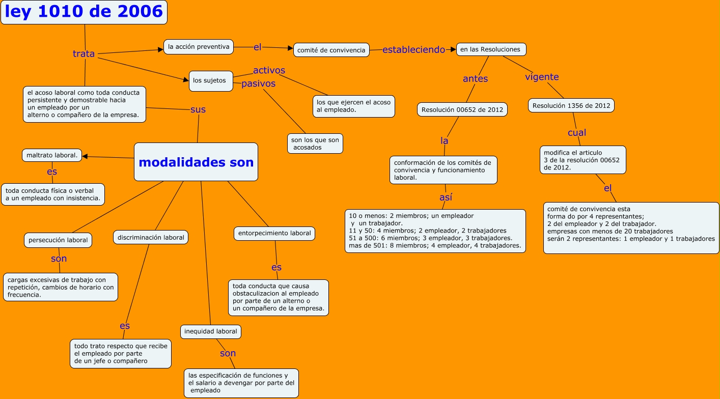 Este Cmap, tiene información relacionada con: ley 1010, conformación de los comités de convivencia y funcionamiento laboral. así 10 o menos: 2 miembros; un empleador y un trabajador. 11 y 50: 4 miembros; 2 empleador, 2 trabajadores 51 a 500: 6 miembros; 3 empleador, 3 trabajadores. mas de 501: 8 miembros; 4 empleador, 4 trabajadores., ley 1010 de 2006 trata la acción preventiva, modalidades son ???? persecución laboral, maltrato laboral. es toda conducta física o verbal a un empleado con insistencia., modalidades son ???? inequidad laboral, ley 1010 de 2006 trata los sujetos, Resolución 00652 de 2012 la conformación de los comités de convivencia y funcionamiento laboral., comité de convivencia estableciendo en las Resoluciones, la acción preventiva el comité de convivencia, modalidades son ???? entorpecimiento laboral, los sujetos pasivos son los que son acosados, persecución laboral son cargas excesivas de trabajo con repetición, cambios de horario con frecuencia., los sujetos activos los que ejercen el acoso al empleado., en las Resoluciones antes Resolución 00652 de 2012, ley 1010 de 2006 trata el acoso laboral como toda conducta persistente y demostrable hacia un empleado por un alterno o compañero de la empresa., modalidades son ???? maltrato laboral., en las Resoluciones vigente Resolución 1356 de 2012, Resolución 1356 de 2012 cual modifica el articulo 3 de la resolución 00652 de 2012., modalidades son ???? discriminación laboral, modifica el articulo 3 de la resolución 00652 de 2012. el comité de convivencia esta forma do por 4 representantes; 2 del empleador y 2 del trabajador. empresas con menos de 20 trabajadores serán 2 representantes: 1 empleador y 1 trabajadores
