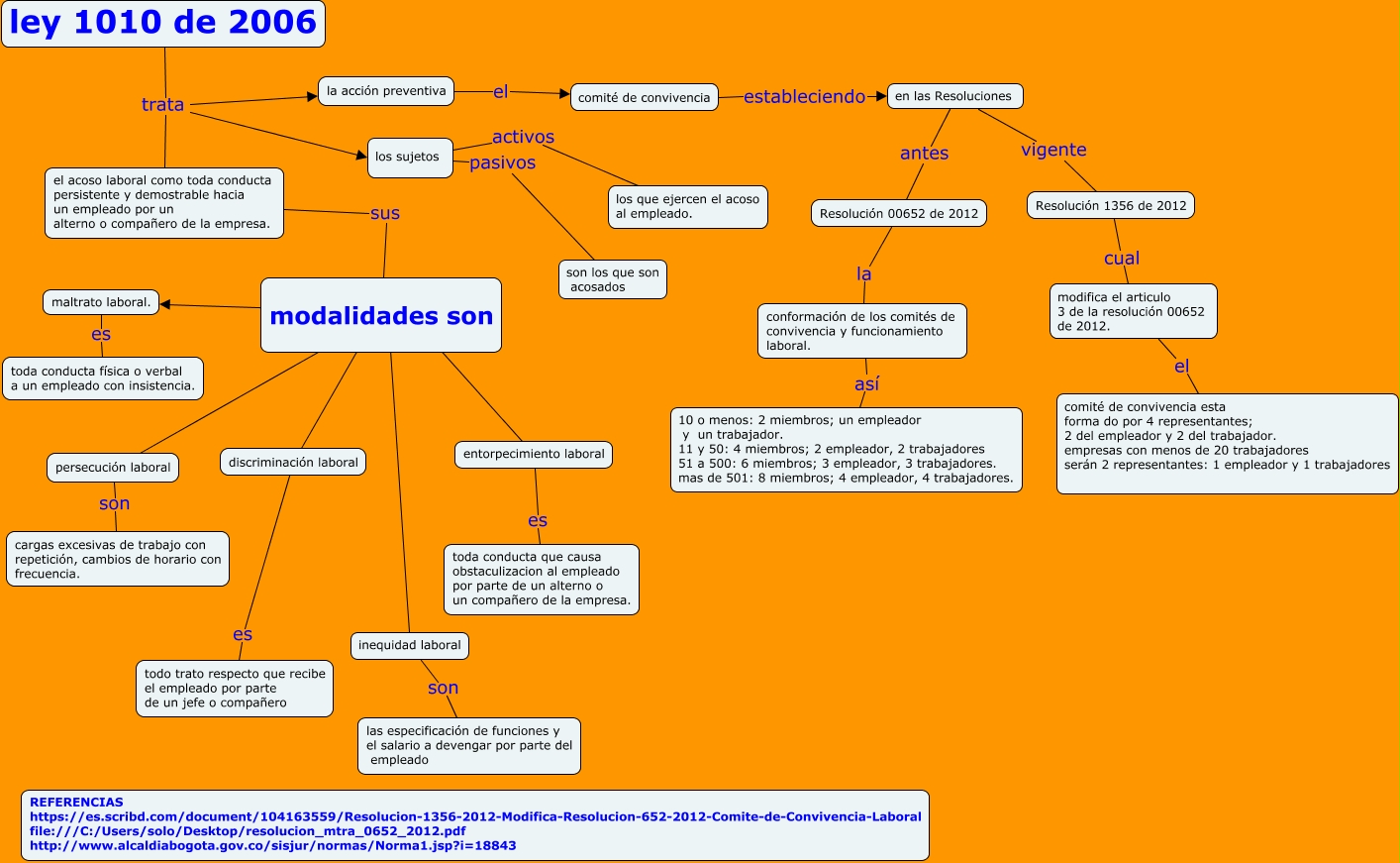 Este Cmap, tiene información relacionada con: ley 1010 de 2012, conformación de los comités de convivencia y funcionamiento laboral. así 10 o menos: 2 miembros; un empleador y un trabajador. 11 y 50: 4 miembros; 2 empleador, 2 trabajadores 51 a 500: 6 miembros; 3 empleador, 3 trabajadores. mas de 501: 8 miembros; 4 empleador, 4 trabajadores., ley 1010 de 2006 trata la acción preventiva, modalidades son ???? persecución laboral, maltrato laboral. es toda conducta física o verbal a un empleado con insistencia., modalidades son ???? inequidad laboral, ley 1010 de 2006 trata los sujetos, Resolución 00652 de 2012 la conformación de los comités de convivencia y funcionamiento laboral., comité de convivencia estableciendo en las Resoluciones, la acción preventiva el comité de convivencia, modalidades son ???? entorpecimiento laboral, los sujetos pasivos son los que son acosados, persecución laboral son cargas excesivas de trabajo con repetición, cambios de horario con frecuencia., los sujetos activos los que ejercen el acoso al empleado., en las Resoluciones antes Resolución 00652 de 2012, ley 1010 de 2006 trata el acoso laboral como toda conducta persistente y demostrable hacia un empleado por un alterno o compañero de la empresa., modalidades son ???? maltrato laboral., en las Resoluciones vigente Resolución 1356 de 2012, Resolución 1356 de 2012 cual modifica el articulo 3 de la resolución 00652 de 2012., modalidades son ???? discriminación laboral, modifica el articulo 3 de la resolución 00652 de 2012. el comité de convivencia esta forma do por 4 representantes; 2 del empleador y 2 del trabajador. empresas con menos de 20 trabajadores serán 2 representantes: 1 empleador y 1 trabajadores