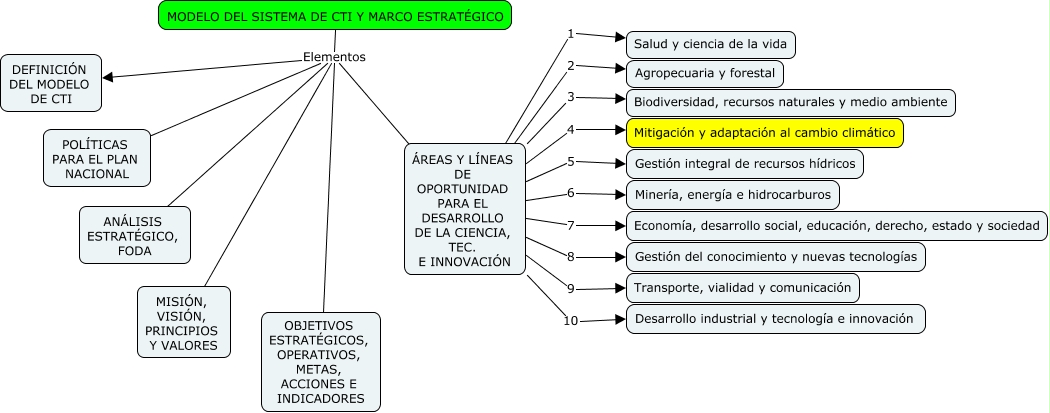 Este Cmap, tiene información relacionada con: Modelo del Sistema, ÁREAS Y LÍNEAS DE OPORTUNIDAD PARA EL DESARROLLO DE LA CIENCIA, TEC. E INNOVACIÓN 8 Gestión del conocimiento y nuevas tecnologías, ÁREAS Y LÍNEAS DE OPORTUNIDAD PARA EL DESARROLLO DE LA CIENCIA, TEC. E INNOVACIÓN 4 Mitigación y adaptación al cambio climático, MODELO DEL SISTEMA DE CTI Y MARCO ESTRATÉGICO Elementos ÁREAS Y LÍNEAS DE OPORTUNIDAD PARA EL DESARROLLO DE LA CIENCIA, TEC. E INNOVACIÓN, MODELO DEL SISTEMA DE CTI Y MARCO ESTRATÉGICO Elementos MISIÓN, VISIÓN, PRINCIPIOS Y VALORES, MODELO DEL SISTEMA DE CTI Y MARCO ESTRATÉGICO Elementos ANÁLISIS ESTRATÉGICO, FODA, ÁREAS Y LÍNEAS DE OPORTUNIDAD PARA EL DESARROLLO DE LA CIENCIA, TEC. E INNOVACIÓN 2 Agropecuaria y forestal, ÁREAS Y LÍNEAS DE OPORTUNIDAD PARA EL DESARROLLO DE LA CIENCIA, TEC. E INNOVACIÓN 7 Economía, desarrollo social, educación, derecho, estado y sociedad, ÁREAS Y LÍNEAS DE OPORTUNIDAD PARA EL DESARROLLO DE LA CIENCIA, TEC. E INNOVACIÓN 1 Salud y ciencia de la vida, ÁREAS Y LÍNEAS DE OPORTUNIDAD PARA EL DESARROLLO DE LA CIENCIA, TEC. E INNOVACIÓN 3 Biodiversidad, recursos naturales y medio ambiente, MODELO DEL SISTEMA DE CTI Y MARCO ESTRATÉGICO Elementos POLÍTICAS PARA EL PLAN NACIONAL, ÁREAS Y LÍNEAS DE OPORTUNIDAD PARA EL DESARROLLO DE LA CIENCIA, TEC. E INNOVACIÓN 5 Gestión integral de recursos hídricos, MODELO DEL SISTEMA DE CTI Y MARCO ESTRATÉGICO Elementos OBJETIVOS ESTRATÉGICOS, OPERATIVOS, METAS, ACCIONES E INDICADORES, ÁREAS Y LÍNEAS DE OPORTUNIDAD PARA EL DESARROLLO DE LA CIENCIA, TEC. E INNOVACIÓN 6 Minería, energía e hidrocarburos, ÁREAS Y LÍNEAS DE OPORTUNIDAD PARA EL DESARROLLO DE LA CIENCIA, TEC. E INNOVACIÓN 10 Desarrollo industrial y tecnología e innovación, ÁREAS Y LÍNEAS DE OPORTUNIDAD PARA EL DESARROLLO DE LA CIENCIA, TEC. E INNOVACIÓN 9 Transporte, vialidad y comunicación, MODELO DEL SISTEMA DE CTI Y MARCO ESTRATÉGICO Elementos DEFINICIÓN DEL MODELO DE CTI