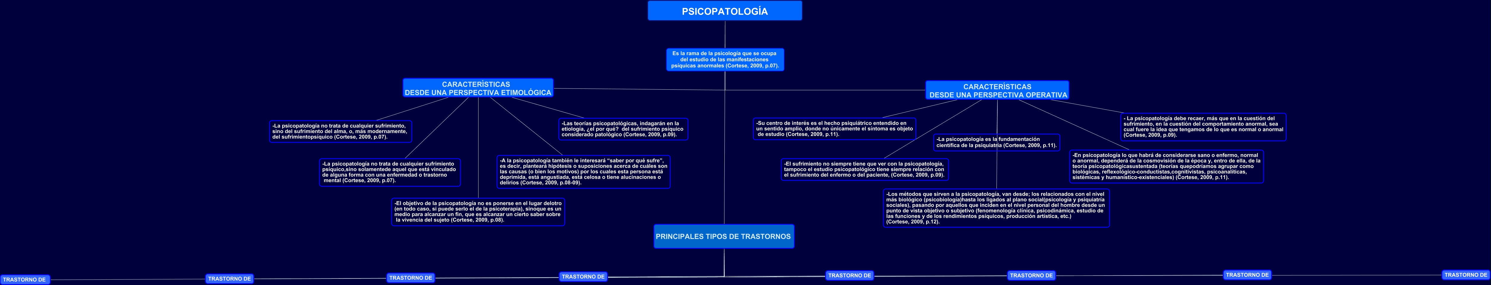 Este Cmap, tiene información relacionada con: Psicopatologìa, PSICOPATOLOGÍA CARACTERÍSTICAS DESDE UNA PERSPECTIVA OPERATIVA - La psicopatología debe recaer, más que en la cuestión del sufrimiento, en la cuestión del comportamiento anormal, sea cual fuere la idea que tengamos de lo que es normal o anormal (Cortese, 2009, p.09)., PSICOPATOLOGÍA CARACTERÍSTICAS DESDE UNA PERSPECTIVA OPERATIVA -El sufrimiento no siempre tiene que ver con la psicopatología, tampoco el estudio psicopatológico tiene siempre relación con el sufrimiento del enfermo o del paciente, (Cortese, 2009, p.09)., PSICOPATOLOGÍA CARACTERÍSTICAS DESDE UNA PERSPECTIVA ETIMOLÓGICA -Las teorías psicopatológicas, indagarán en la etiología, ¿el por qué? del sufrimiento psíquico considerado patológico (Cortese, 2009, p.09)., PSICOPATOLOGÍA PRINCIPALES TIPOS DE TRASTORNOS TRASTORNO DE, PSICOPATOLOGÍA PRINCIPALES TIPOS DE TRASTORNOS TRASTORNO DE, PSICOPATOLOGÍA PRINCIPALES TIPOS DE TRASTORNOS TRASTORNO DE, PSICOPATOLOGÍA CARACTERÍSTICAS DESDE UNA PERSPECTIVA OPERATIVA -En psicopatología lo que habrá de considerarse sano o enfermo, normal o anormal, dependerá de la cosmovisión de la época y, entro de ella, de la teoría psicopatológicasustentada (teorías quepodríamos agrupar como biológicas, reflexológico-conductistas,cognitivistas, psicoanalíticas, sistémicas y humanístico-existenciales) (Cortese, 2009, p.11)., PSICOPATOLOGÍA PRINCIPALES TIPOS DE TRASTORNOS TRASTORNO DE, PSICOPATOLOGÍA CARACTERÍSTICAS DESDE UNA PERSPECTIVA ETIMOLÓGICA -A la psicopatología también le interesará “saber por qué sufre”, es decir, planteará hipótesis o suposiciones acerca de cuáles son las causas (o bien los motivos) por los cuales esta persona está deprimida, está angustiada, está celosa o tiene alucinaciones o delirios (Cortese, 2009, p.08-09)., PSICOPATOLOGÍA CARACTERÍSTICAS DESDE UNA PERSPECTIVA OPERATIVA -La psicopatología es la fundamentación científica de la psiquiatría (Cortese, 2009, p.11)., PSICOPATOLOGÍA CARACTERÍSTICAS DESDE UNA PERSPECTIVA ETIMOLÓGICA -La psicopatología no trata de cualquier sufrimiento, sino del sufrimiento del alma, o, más modernamente, del sufrimientopsíquico (Cortese, 2009, p.07)., PSICOPATOLOGÍA CARACTERÍSTICAS DESDE UNA PERSPECTIVA OPERATIVA -Los métodos que sirven a la psicopatología, van desde; los relacionados con el nivel más biológico (psicobiología)hasta los ligados al plano social(psicología y psiquiatría sociales), pasando por aquellos que inciden en el nivel personal del hombre desde un punto de vista objetivo o subjetivo (fenomenología clínica, psicodinámica, estudio de las funciones y de los rendimientos psíquicos, producción artística, etc.) (Cortese, 2009, p.12)., PSICOPATOLOGÍA PRINCIPALES TIPOS DE TRASTORNOS TRASTORNO DE, PSICOPATOLOGÍA PRINCIPALES TIPOS DE TRASTORNOS TRASTORNO DE, PSICOPATOLOGÍA PRINCIPALES TIPOS DE TRASTORNOS TRASTORNO DE, PSICOPATOLOGÍA CARACTERÍSTICAS DESDE UNA PERSPECTIVA OPERATIVA -Su centro de interés es el hecho psiquiátrico entendido en un sentido amplio, donde no únicamente el síntoma es objeto de estudio (Cortese, 2009, p.11)., PSICOPATOLOGÍA PRINCIPALES TIPOS DE TRASTORNOS TRASTORNO DE, PSICOPATOLOGÍA CARACTERÍSTICAS DESDE UNA PERSPECTIVA ETIMOLÓGICA -El objetivo de la psicopatología no es ponerse en el lugar delotro (en todo caso, si puede serlo el de la psicoterapia), sinoque es un medio para alcanzar un fin, que es alcanzar un cierto saber sobre la vivencia del sujeto (Cortese, 2009, p.08)., PSICOPATOLOGÍA CARACTERÍSTICAS DESDE UNA PERSPECTIVA ETIMOLÓGICA -La psicopatología no trata de cualquier sufrimiento psíquico,sino solamentede aquel que está vinculado de alguna forma con una enfermedad o trastorno mental (Cortese, 2009, p.07).