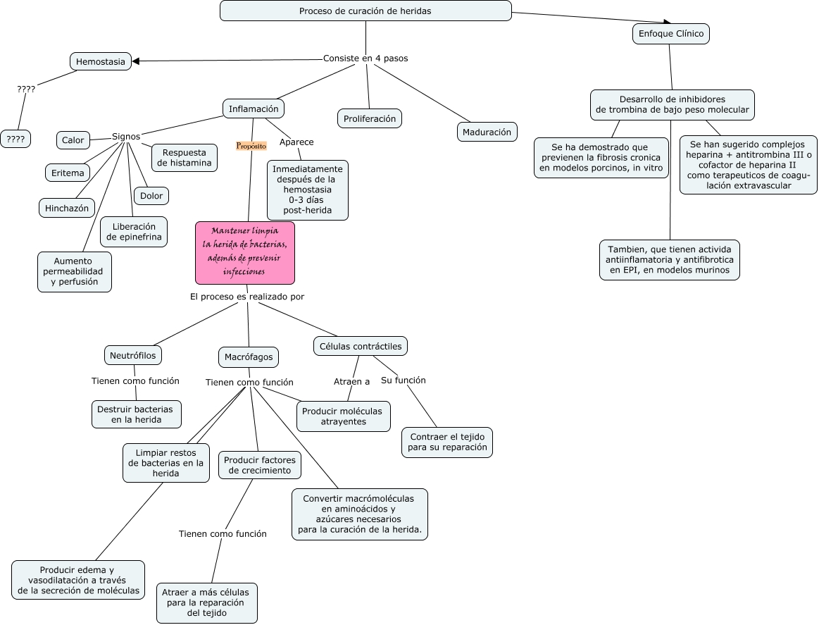 Este Cmap, tiene información relacionada con: Trombina en intersticio, Producir factores de crecimiento Tienen como función Atraer a más células para la reparación del tejido, Proceso de curación de heridas ???? Enfoque Clínico, Macrófagos Tienen como función Producir moléculas atrayentes, Células contráctiles Su función Contraer el tejido para su reparación, Macrófagos Tienen como función Convertir macrómoléculas en aminoácidos y azúcares necesarios para la curación de la herida., Macrófagos Tienen como función Limpiar restos de bacterias en la herida, Macrófagos Tienen como función Producir edema y vasodilatación a través de la secreción de moléculas, Inflamación Aparece Inmediatamente después de la hemostasia 0-3 días post-herida, Inflamación Signos Hinchazón, Inflamación Signos Eritema, Neutrófilos Tienen como función Destruir bacterias en la herida, Proceso de curación de heridas Consiste en 4 pasos Inflamación, Inflamación Signos Dolor, Desarrollo de inhibidores de trombina de bajo peso molecular ???? Se han sugerido complejos heparina + antitrombina III o cofactor de heparina II como terapeuticos de coagu- lación extravascular, Hemostasia ???? ????, Inflamación Signos Liberación de epinefrina, Mantener limpia la herida de bacterias, además de prevenir infecciones El proceso es realizado por Neutrófilos, Mantener limpia la herida de bacterias, además de prevenir infecciones El proceso es realizado por Macrófagos, Inflamación Signos Calor, Inflamación Signos Aumento permeabilidad y perfusión