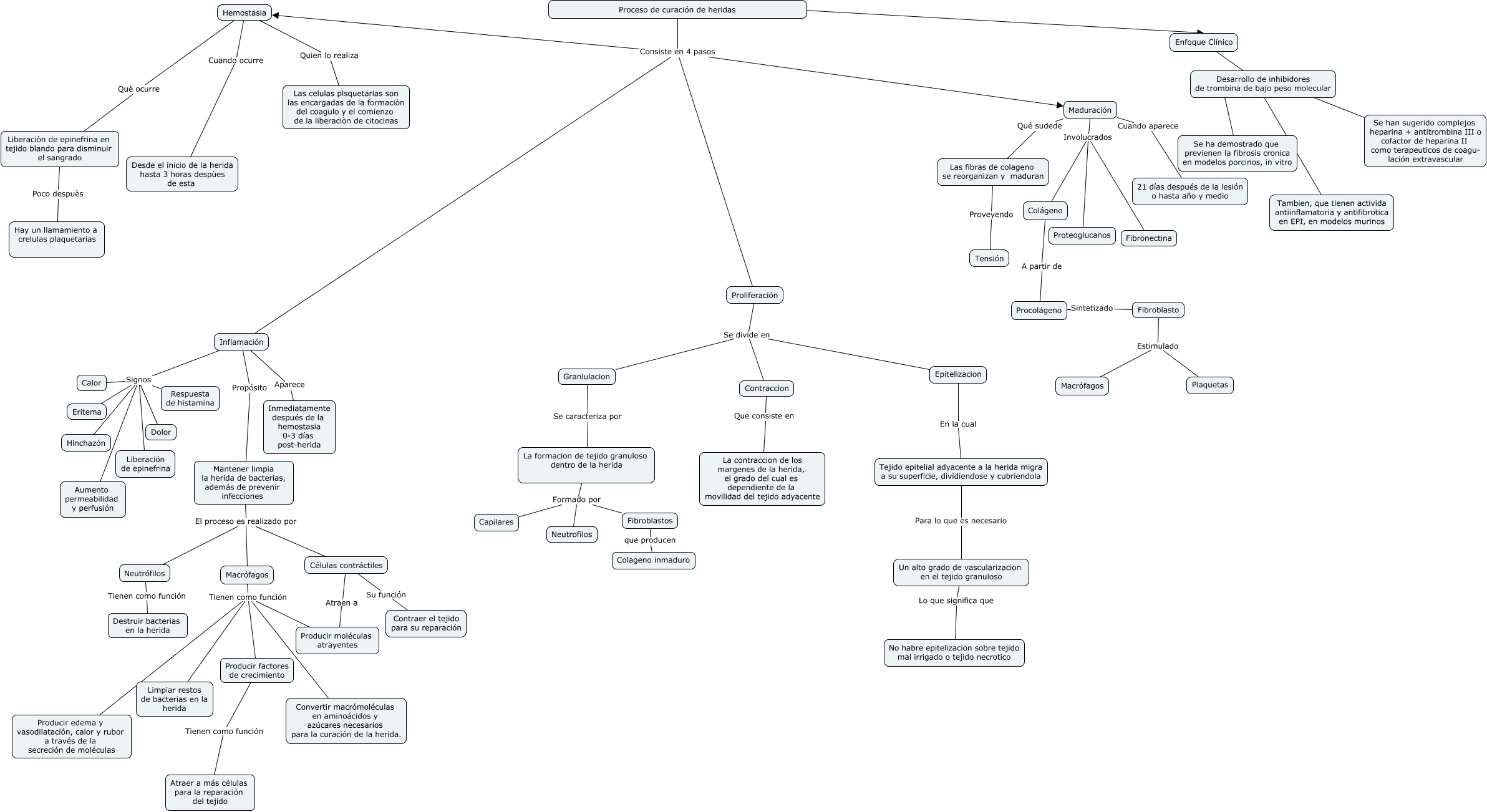 Este Cmap, tiene información relacionada con: tROMBINA 2, Fibroblasto Estimulado Plaquetas, Maduración Involucrados Fibronectina, Producir factores de crecimiento Tienen como función Atraer a más células para la reparación del tejido, La formacion de tejido granuloso dentro de la herida Formado por Neutrofilos, Macrófagos Tienen como función Producir moléculas atrayentes, Maduración Involucrados Proteoglucanos, Inflamación Signos Hinchazón, Macrófagos Tienen como función Producir edema y vasodilatación, calor y rubor a través de la secreción de moléculas, Inflamación Signos Dolor, Un alto grado de vascularizacion en el tejido granuloso Lo que significa que No habre epitelizacion sobre tejido mal irrigado o tejido necrotico, Mantener limpia la herida de bacterias, además de prevenir infecciones El proceso es realizado por Macrófagos, Inflamación Signos Aumento permeabilidad y perfusión, Inflamación Signos Respuesta de histamina, Desarrollo de inhibidores de trombina de bajo peso molecular ???? Se ha demostrado que previenen la fibrosis cronica en modelos porcinos, in vitro, Liberaciòn de epinefrina en tejido blando para disminuir el sangrado Poco despuès Hay un llamamiento a crelulas plaquetarias, Desarrollo de inhibidores de trombina de bajo peso molecular ???? Se han sugerido complejos heparina + antitrombina III o cofactor de heparina II como terapeuticos de coagu- lación extravascular, Proceso de curación de heridas ???? Enfoque Clínico, Inflamación Signos Eritema, Desarrollo de inhibidores de trombina de bajo peso molecular ???? Tambien, que tienen activida antiinflamatoria y antifibrotica en EPI, en modelos murinos, Proceso de curación de heridas Consiste en 4 pasos Hemostasia