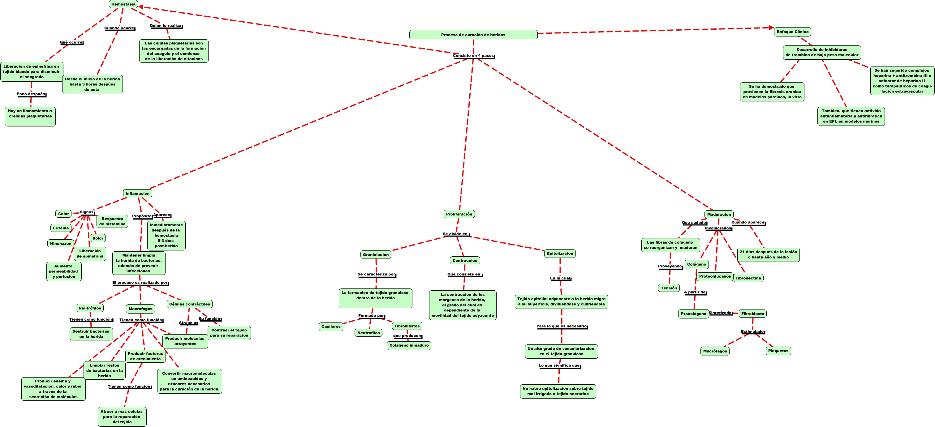Este Cmap, tiene información relacionada con: peñamapa, Fibroblasto Estimulado Plaquetas, Maduración Involucrados Fibronectina, Producir factores de crecimiento Tienen como función Atraer a más células para la reparación del tejido, La formacion de tejido granuloso dentro de la herida Formado por Neutrofilos, Macrófagos Tienen como función Producir moléculas atrayentes, Maduración Involucrados Proteoglucanos, Inflamación Signos Hinchazón, Macrófagos Tienen como función Producir edema y vasodilatación, calor y rubor a través de la secreción de moléculas, Inflamación Signos Dolor, Un alto grado de vascularizacion en el tejido granuloso Lo que significa que No habre epitelizacion sobre tejido mal irrigado o tejido necrotico, Mantener limpia la herida de bacterias, además de prevenir infecciones El proceso es realizado por Macrófagos, Inflamación Signos Aumento permeabilidad y perfusión, Inflamación Signos Respuesta de histamina, Desarrollo de inhibidores de trombina de bajo peso molecular ???? Se ha demostrado que previenen la fibrosis cronica en modelos porcinos, in vitro, Liberaciòn de epinefrina en tejido blando para disminuir el sangrado Poco despuès Hay un llamamiento a crelulas plaquetarias, Desarrollo de inhibidores de trombina de bajo peso molecular ???? Se han sugerido complejos heparina + antitrombina III o cofactor de heparina II como terapeuticos de coagu- lación extravascular, Proceso de curación de heridas ???? Enfoque Clínico, Inflamación Signos Eritema, Desarrollo de inhibidores de trombina de bajo peso molecular ???? Tambien, que tienen activida antiinflamatoria y antifibrotica en EPI, en modelos murinos, Proceso de curación de heridas Consiste en 4 pasos Hemostasia