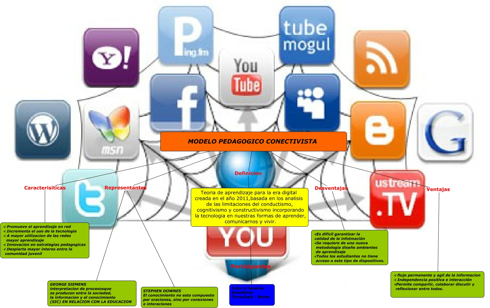 Este Cmap, tiene información relacionada con: CONECTIVISMO EJE II, MODELO PEDAGOGICO CONECTIVISTA Representantes STEPHEN DOWNES El conocimiento no esta compuesto por oraciones, sino por conexiones e interaciones, MODELO PEDAGOGICO CONECTIVISTA Desventajas ≺Es dificil garantizar la calidad de la infotmación ≺Se requiere de una nueva metodologia diseñe ambientes de aprendizaje ≺Todos los estudiantes no tiene acceso a este tipo de dispositivos., MODELO PEDAGOGICO CONECTIVISTA Ventajas ≺ flujo permanente y agil de la informacion ≺ Independencia positiva e interacción ≺Permite compartir, colaborar discutir y reflexionar entre todos., MODELO PEDAGOGICO CONECTIVISTA Definicion Teoria de aprendizaje para la era digital creada en el año 2011,basada en los analisis de las limitaciones del conductismo, cognitivismo y constructivismo incorporando la tecnologia en nuestras formas de aprender, comunicarnos y vivir., Teoria de aprendizaje para la era digital creada en el año 2011,basada en los analisis de las limitaciones del conductismo, cognitivismo y constructivismo incorporando la tecnologia en nuestras formas de aprender, comunicarnos y vivir. Participantes Tutor o Docente Estudiante Tecnologia - Redes, MODELO PEDAGOGICO CONECTIVISTA Representantes GEORGE SIEMENS interpretacion de procesosque se producen entre la sociedad, la informacion y el conocimiento (SIC) EN RELACION CON LA EDUCACION, MODELO PEDAGOGICO CONECTIVISTA Caracterisiticas ≺ Promueve el aprendizaje en red ≺ Incrementa el uso de la tecnologia ≺ A mayor utilizacion de las redes mayor aprendizaje ≺ Innovacion en estrategias pedagogicas ≺ Despierta mayor interes entre la comunidad juvenil