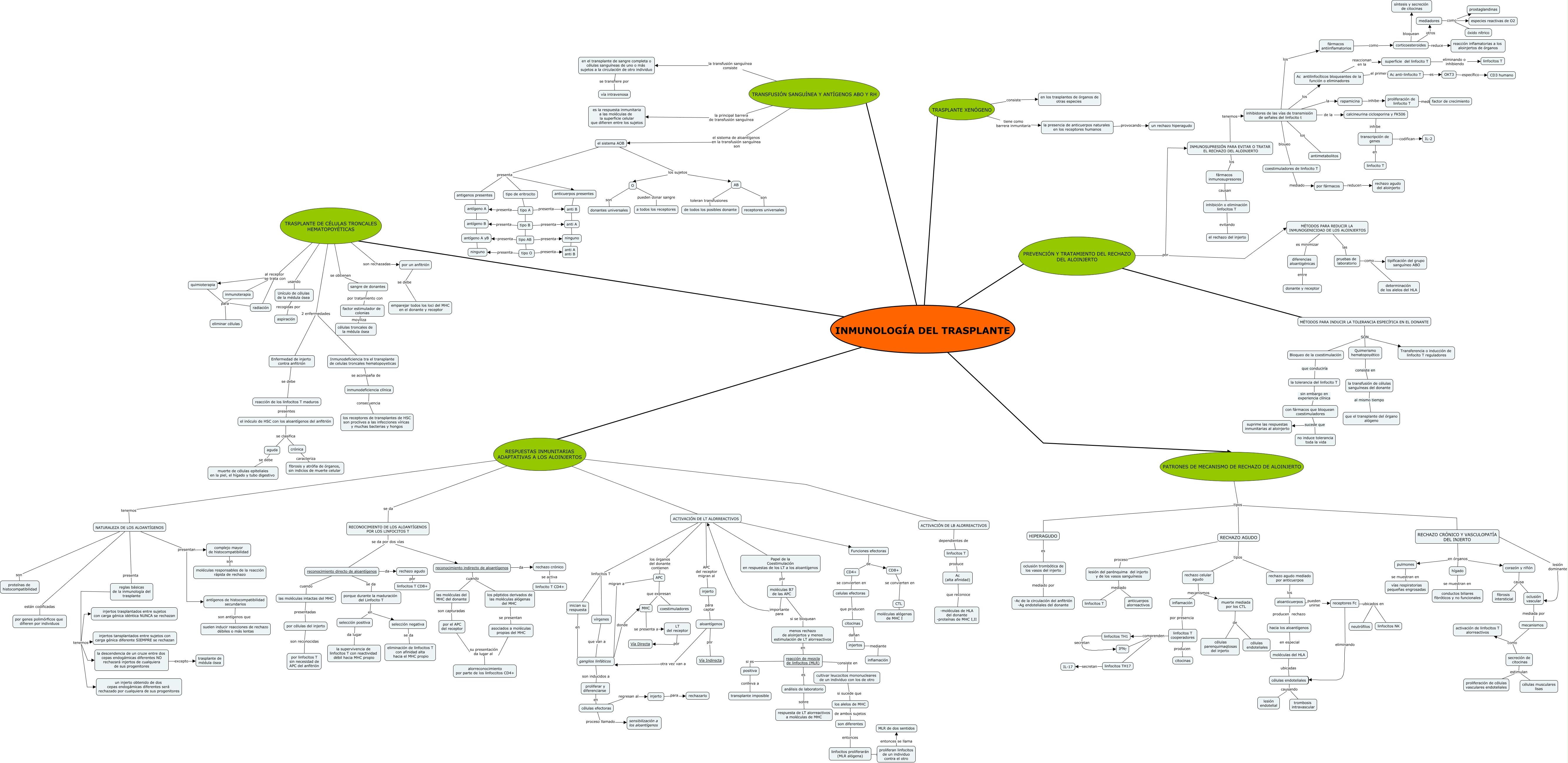 Este Cmap, tiene información relacionada con: Tópico 16 - Inmunologia del trasplante, ganglios linfáticos son inducidos a proliferar y diferenciarse, tipo B ???? tipo AB, diferencias aloantigénicas entre donante y receptor, RECHAZO CRÓNICO Y VASCULOPATÍA DEL INJERTO lesión dominante oclusión vascular, aguda se debe muerte de células epiteliales en la piel, el hígado y tubo digestivo, MÉTODOS PARA INDUCIR LA TOLERANCIA ESPECÍFICA EN EL DONANTE SON Bloqueo de la coestimulación, RESPUESTAS INMUNITARIAS ADAPTATIVAS A LOS ALOINJERTOS tenemos NATURALEZA DE LOS ALOANTÍGENOS, moléculas del HLA ubicadas células endoteliales, rechazo agudo por linfocitos T CD8+, hígado se muestran en conductos biliares fibróticos y no funcionales, INMUNOLOGÍA DEL TRASPLANTE ???? TRASPLANTE DE CÉLULAS TRONCALES HEMATOPOYÉTICAS, CD8+ se convierten en CTL, INMUNOLOGÍA DEL TRASPLANTE PATRONES DE MECANISMO DE RECHAZO DE ALOINJERTO, INMUNOLOGÍA DEL TRASPLANTE ???? RESPUESTAS INMUNITARIAS ADAPTATIVAS A LOS ALOINJERTOS, RECONOCIMIENTO DE LOS ALOANTÍGENOS POR LOS LINFOCITOS T se da por dos vìas reconocimiento indirecto de aloantígenos, rechazo agudo mediado por anticuerpos los aloanticuerpos, corticoesteroides otros mediadores, vírgenes que van a ganglios linfáticos, selección negativa se da eliminación de linfocitos T con afinidad alta hacia el MHC propio, reconocimiento directo de aloantígenos da rechazo agudo