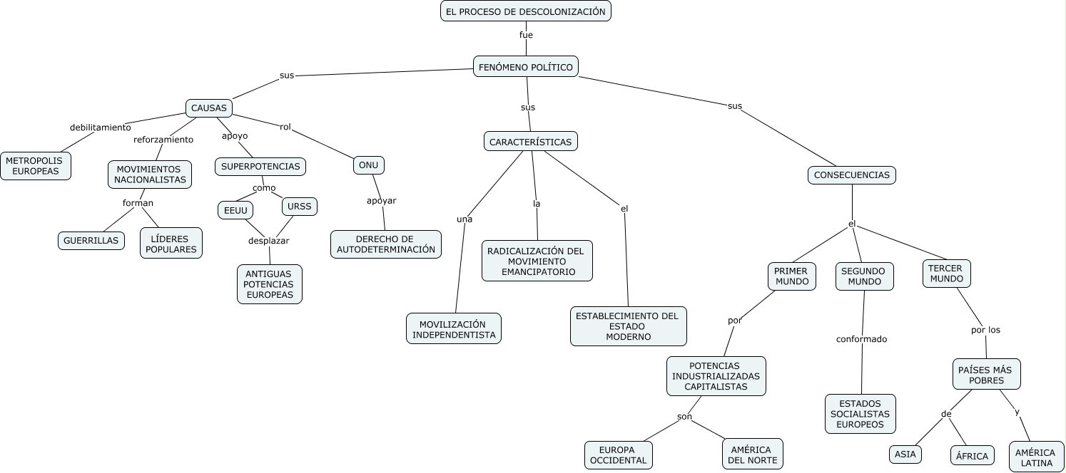 Este Cmap, tiene información relacionada con: PROCESO DE DESCOLONIZACIÓN, EEUU desplazar ANTIGUAS POTENCIAS EUROPEAS, ONU apoyar DERECHO DE AUTODETERMINACIÓN, CARACTERÍSTICAS la RADICALIZACIÓN DEL MOVIMIENTO EMANCIPATORIO, PAÍSES MÁS POBRES de ASIA, MOVIMIENTOS NACIONALISTAS forman LÍDERES POPULARES, CARACTERÍSTICAS el ESTABLECIMIENTO DEL ESTADO MODERNO, POTENCIAS INDUSTRIALIZADAS CAPITALISTAS son AMÉRICA DEL NORTE, CAUSAS rol ONU, FENÓMENO POLÍTICO sus CAUSAS, SEGUNDO MUNDO conformado ESTADOS SOCIALISTAS EUROPEOS, URSS desplazar ANTIGUAS POTENCIAS EUROPEAS, CONSECUENCIAS el PRIMER MUNDO, CAUSAS apoyo SUPERPOTENCIAS, CAUSAS debilitamiento METROPOLIS EUROPEAS, FENÓMENO POLÍTICO sus CARACTERÍSTICAS, CONSECUENCIAS el TERCER MUNDO, CONSECUENCIAS el SEGUNDO MUNDO, TERCER MUNDO por los PAÍSES MÁS POBRES, PRIMER MUNDO por POTENCIAS INDUSTRIALIZADAS CAPITALISTAS, SUPERPOTENCIAS como EEUU