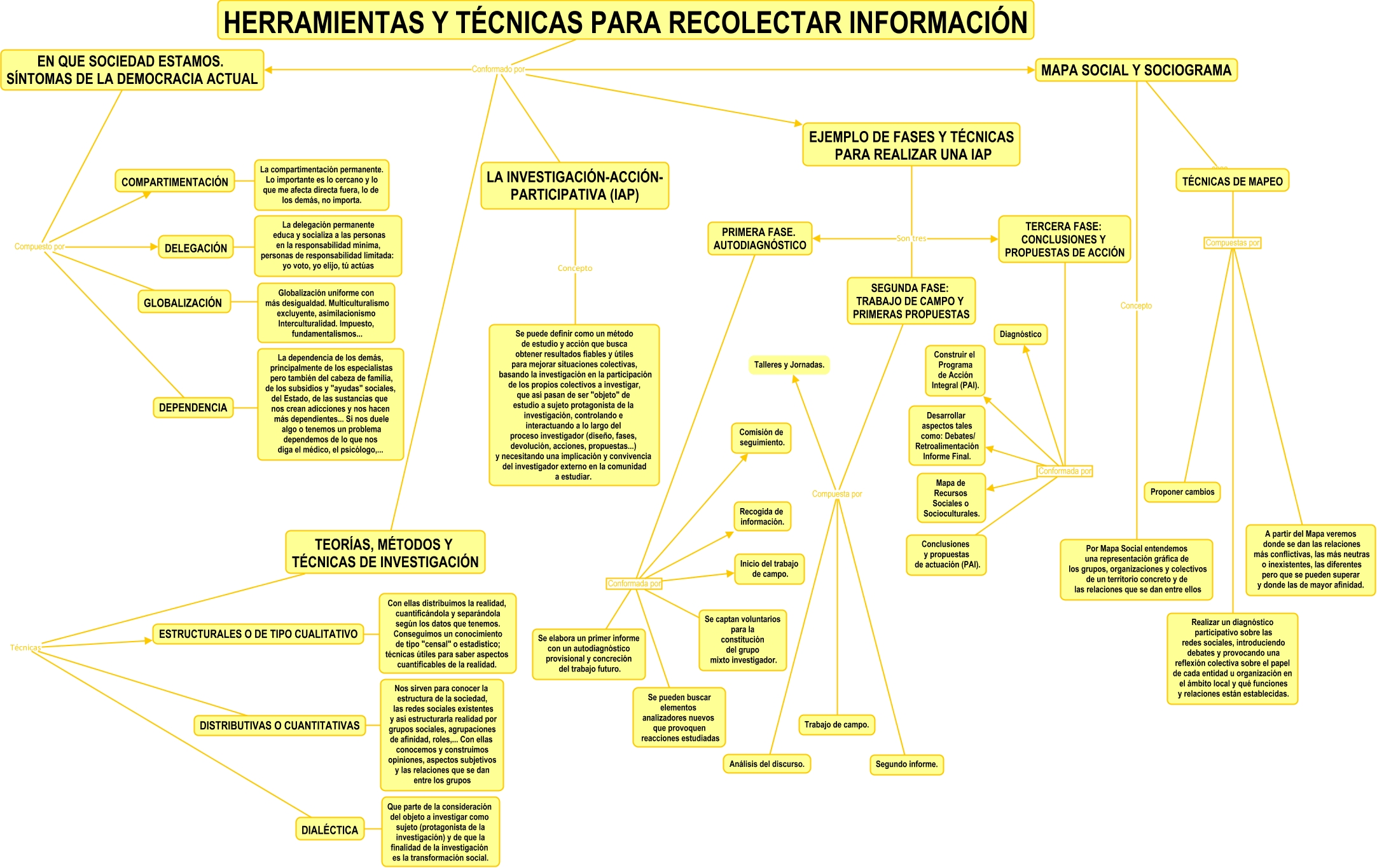Este Cmap, tiene información relacionada con: Herramientas y técnicas para recolectar información, MAPA SOCIAL Y SOCIOGRAMA Concepto Por Mapa Social entendemos una representación gráfica de los grupos, organizaciones y colectivos de un territorio concreto y de las relaciones que se dan entre ellos, DIALÉCTICA ???? Que parte de la consideración del objeto a investigar como sujeto (protagonista de la investigación) y de que la finalidad de la investigación es la transformación social., GLOBALIZACIÓN ???? Globalización uniforme con más desigualdad. Multiculturalismo excluyente, asimilacionismo Interculturalidad. Impuesto, fundamentalismos..., SEGUNDA FASE: TRABAJO DE CAMPO Y PRIMERAS PROPUESTAS Compuesta por Talleres y Jornadas., HERRAMIENTAS Y TÉCNICAS PARA RECOLECTAR INFORMACIÓN Conformado por EJEMPLO DE FASES Y TÉCNICAS PARA REALIZAR UNA IAP, COMPARTIMENTACIÓN ???? La compartimentación permanente. Lo importante es lo cercano y lo que me afecta directa fuera, lo de los demás, no importa., TÉCNICAS DE MAPEO Compuestas por Proponer cambios, DISTRIBUTIVAS O CUANTITATIVAS ???? Nos sirven para conocer la estructura de la sociedad, las redes sociales existentes y así estructurarla realidad por grupos sociales, agrupaciones de afinidad, roles,... Con ellas conocemos y construimos opiniones, aspectos subjetivos y las relaciones que se dan entre los grupos, PRIMERA FASE. AUTODIAGNÓSTICO Conformada por Se pueden buscar elementos analizadores nuevos que provoquen reacciones estudiadas, EJEMPLO DE FASES Y TÉCNICAS PARA REALIZAR UNA IAP Son tres TERCERA FASE: CONCLUSIONES Y PROPUESTAS DE ACCIÓN, ESTRUCTURALES O DE TIPO CUALITATIVO ???? Con ellas distribuimos la realidad, cuantificándola y separándola según los datos que tenemos. Conseguimos un conocimiento de tipo "censal" o estadístico; técnicas útiles para saber aspectos cuantificables de la realidad., TÉCNICAS DE MAPEO Compuestas por A partir del Mapa veremos donde se dan las relaciones más conflictivas, las más neutras o inexistentes, las diferentes pero que se pueden superar y donde las de mayor afinidad., DELEGACIÓN ???? La delegación permanente educa y socializa a las personas en la responsabilidad mínima, personas de responsabilidad limitada: yo voto, yo elijo, tú actúas, TEORÍAS, MÉTODOS Y TÉCNICAS DE INVESTIGACIÓN Técnicas ESTRUCTURALES O DE TIPO CUALITATIVO, DEPENDENCIA ???? La dependencia de los demás, principalmente de los especialistas pero también del cabeza de familia, de los subsidios y "ayudas" sociales, del Estado, de las sustancias que nos crean adicciones y nos hacen más dependientes... Si nos duele algo o tenemos un problema dependemos de lo que nos diga el médico, el psicólogo,..., TERCERA FASE: CONCLUSIONES Y PROPUESTAS DE ACCIÓN Conformada por Diagnóstico, EN QUE SOCIEDAD ESTAMOS. SÍNTOMAS DE LA DEMOCRACIA ACTUAL Compuesto por DELEGACIÓN, PRIMERA FASE. AUTODIAGNÓSTICO Conformada por Comisión de seguimiento., PRIMERA FASE. AUTODIAGNÓSTICO Conformada por Se elabora un primer informe con un autodiagnóstico provisional y concreción del trabajo futuro., SEGUNDA FASE: TRABAJO DE CAMPO Y PRIMERAS PROPUESTAS Compuesta por Segundo informe.