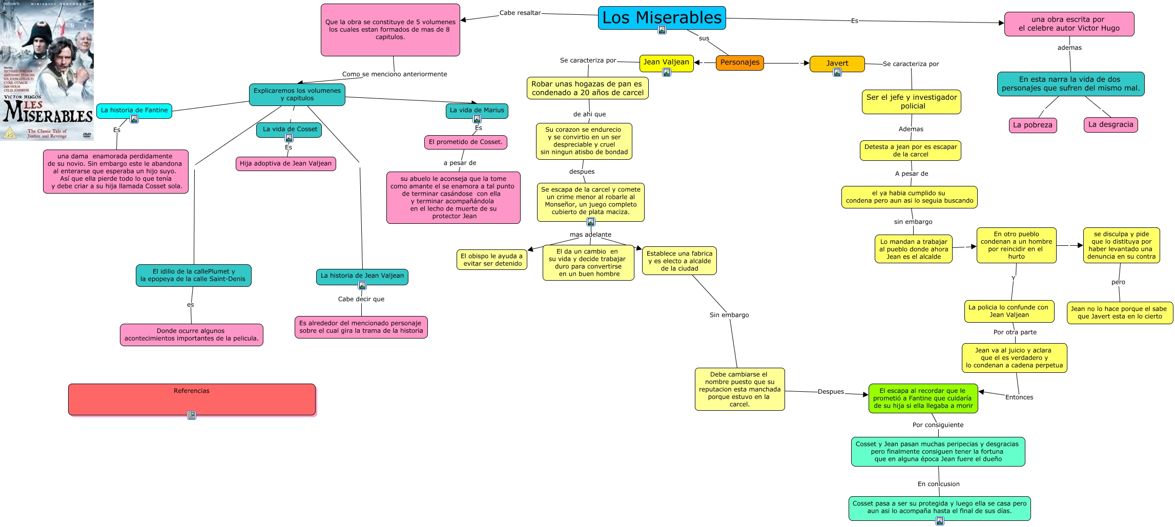 Este Cmap, tiene información relacionada con: Mapa conceptual de Los miserables, La vida de Cosset Es Hija adoptiva de Jean Valjean, Explicaremos los volumenes y capitulos La vida de Marius, Se escapa de la carcel y comete un crime menor al robarle al Monseñor, un juego completo cubierto de plata maciza. mas adelante El obispo le ayuda a evitar ser detenido, Los Miserables Cabe resaltar Que la obra se constituye de 5 volumenes los cuales estan formados de mas de 8 capitulos., Personajes Javert, En esta narra la vida de dos personajes que sufren del mismo mal. La desgracia, Explicaremos los volumenes y capitulos El idilio de la callePlumet y la epopeya de la calle Saint-Denis, La vida de Marius Es El prometido de Cosset., Explicaremos los volumenes y capitulos La historia de Jean Valjean, Los Miserables Es una obra escrita por el celebre autor Victor Hugo, Se escapa de la carcel y comete un crime menor al robarle al Monseñor, un juego completo cubierto de plata maciza. mas adelante Establece una fabrica y es electo a alcalde de la ciudad, Personajes Jean Valjean, una obra escrita por el celebre autor Victor Hugo ademas En esta narra la vida de dos personajes que sufren del mismo mal., Establece una fabrica y es electo a alcalde de la ciudad Sin embargo Debe cambiarse el nombre puesto que su reputacion esta manchada porque estuvo en la carcel., Detesta a jean por es escapar de la carcel A pesar de el ya habia cumplido su condena pero aun asi lo seguia buscando, En otro pueblo condenan a un hombre por reincidir en el hurto Y La policia lo confunde con Jean Valjean, Se escapa de la carcel y comete un crime menor al robarle al Monseñor, un juego completo cubierto de plata maciza. mas adelante El da un cambio en su vida y decide trabajar duro para convertirse en un buen hombre, La historia de Fantine Es una dama enamorada perdidamente de su novio. Sin embargo este le abandona al enterarse que esperaba un hijo suyo. Así que ella pierde todo lo que tenía y debe criar a su hija llamada Cosset sola., Jean va al juicio y aclara que el es verdadero y lo condenan a cadena perpetua Entonces El escapa al recordar que le prometió a Fantine que cuidaría de su hija si ella llegaba a morir, En otro pueblo condenan a un hombre por reincidir en el hurto se disculpa y pide que lo distituya por haber levantado una denuncia en su contra