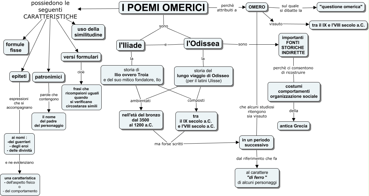 Questa Cmap, creata con IHMC CmapTools, contiene informazioni relative a: poemi omerici, in un periodo successivo dal riferimento che fa al carattere "di ferro" di alcuni personaggi, OMERO che alcuni studiosi ritengono sia vissuto in un periodo successivo, l'Iliade e l'Odissea, patronimici parole che contengono il nome del padre del personaggio, OMERO sul quale si dibatte la "questione omerica", costumi comportamenti organizzazione sociale della antica Grecia, storia di Ilio ovvero Troia e del suo mitico fondatore, Ilo composti tra il IX secolo a.C. e l'VIII secolo a.C., I POEMI OMERICI possiedono le seguenti CARATTERISTICHE formule fisse, I POEMI OMERICI sono l'Iliade, I POEMI OMERICI possiedono le seguenti CARATTERISTICHE uso della similitudine, I POEMI OMERICI possiedono le seguenti CARATTERISTICHE patronimici, storia del lungo viaggio di Odisseo (per il latini Ulisse) ambientati nell'età del bronzo dal 3500 al 1200 a.C., I POEMI OMERICI perchè attribuiti a OMERO, importanti FONTI STORICHE INDIRETTE perchè ci consentono di ricostruire costumi comportamenti organizzazione sociale, epiteti espressioni che si accompagnano ai nomi : -dei guerrieri - degli eroi - delle divinità, I POEMI OMERICI possiedono le seguenti CARATTERISTICHE epiteti, l'Iliade la storia di Ilio ovvero Troia e del suo mitico fondatore, Ilo, OMERO vissuto tra il IX e l'VIII secolo a.C., I POEMI OMERICI sono l'Odissea, storia di Ilio ovvero Troia e del suo mitico fondatore, Ilo ambientati nell'età del bronzo dal 3500 al 1200 a.C.