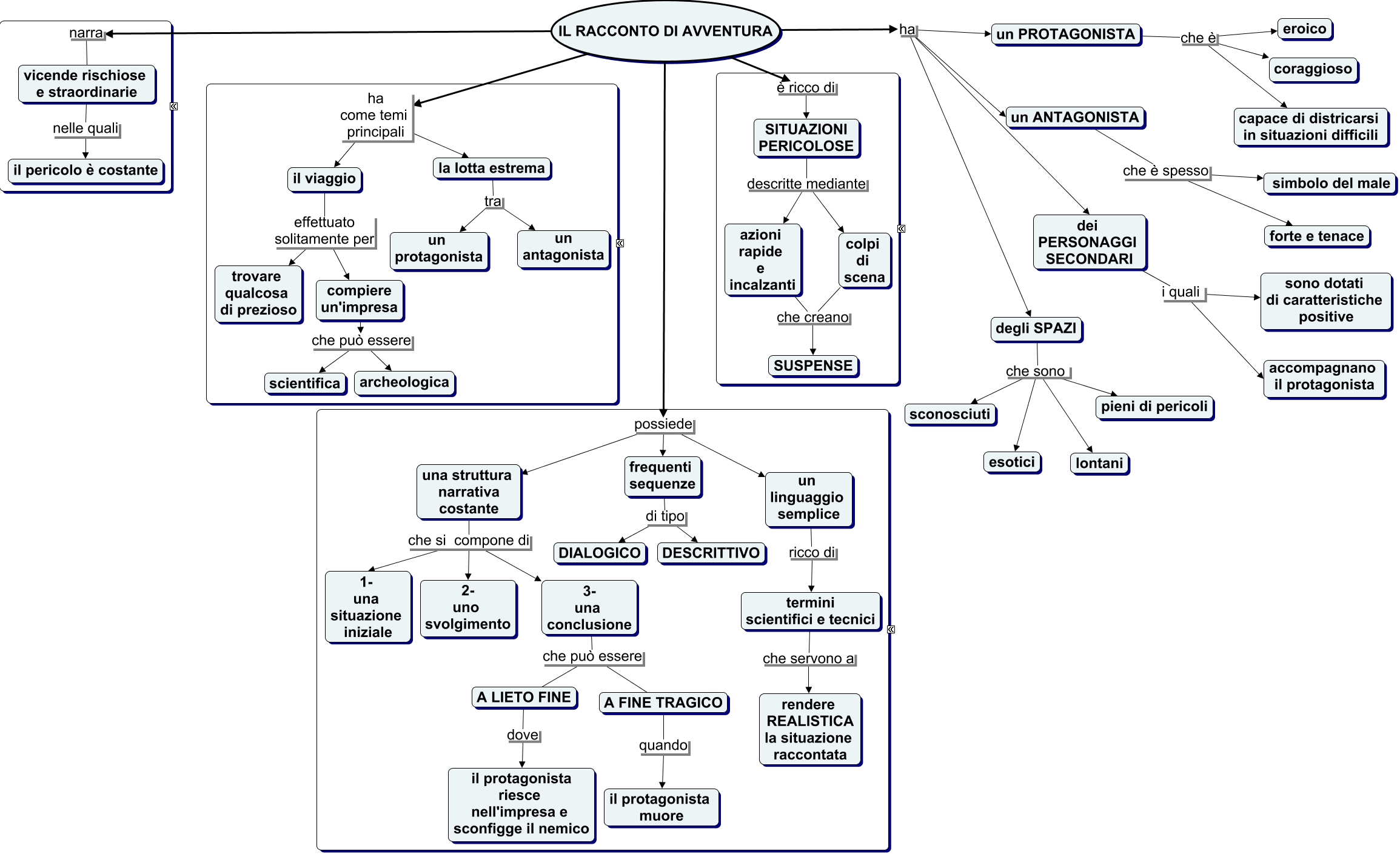 Questa Cmap, creata con IHMC CmapTools, contiene informazioni relative a: IL RACCONTO di AVVENTURA, un linguaggio semplice ricco di termini scientifici e tecnici, dei PERSONAGGI SECONDARI i quali sono dotati di caratteristiche positive, IL RACCONTO DI AVVENTURA ha un ANTAGONISTA, compiere un'impresa che può essere scientifica, una struttura narrativa costante che si compone di 2- uno svolgimento, il viaggio effettuato solitamente per trovare qualcosa di prezioso, una struttura narrativa costante che si compone di 3- una conclusione, compiere un'impresa che può essere archeologica, IL RACCONTO DI AVVENTURA possiede un linguaggio semplice, IL RACCONTO DI AVVENTURA ha dei PERSONAGGI SECONDARI, vicende rischiose e straordinarie nelle quali il pericolo è costante, frequenti sequenze di tipo DESCRITTIVO, un ANTAGONISTA che è spesso simbolo del male, IL RACCONTO DI AVVENTURA è ricco di SITUAZIONI PERICOLOSE, un PROTAGONISTA che è capace di districarsi in situazioni difficili, IL RACCONTO DI AVVENTURA narra vicende rischiose e straordinarie, SITUAZIONI PERICOLOSE descritte mediante azioni rapide e incalzanti, 3- una conclusione che può essere A FINE TRAGICO, azioni rapide e incalzanti che creano colpi di scena, IL RACCONTO DI AVVENTURA ha come temi principali la lotta estrema