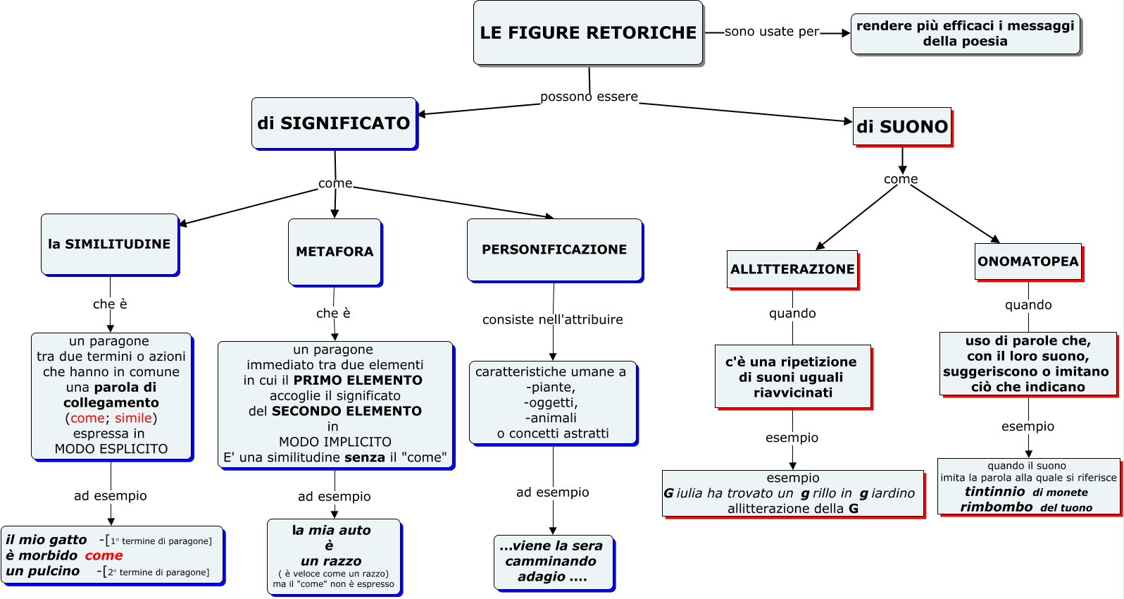 Questa Cmap, creata con IHMC CmapTools, contiene informazioni relative a: LE FIGURE RETORICHE, LE FIGURE RETORICHE possono essere di SUONO, LE FIGURE RETORICHE sono usate per rendere più efficaci i messaggi della poesia, di SUONO come ONOMATOPEA, di SIGNIFICATO come METAFORA, METAFORA che è un paragone immediato tra due elementi in cui il PRIMO ELEMENTO accoglie il significato del SECONDO ELEMENTO in MODO IMPLICITO E' una similitudine senza il "come", LE FIGURE RETORICHE possono essere di SIGNIFICATO, un paragone tra due termini o azioni che hanno in comune una parola di collegamento (come; simile) espressa in MODO ESPLICITO ad esempio il mio gatto -[1° termine di paragone] è morbido come un pulcino -[2° termine di paragone], c'è una ripetizione di suoni uguali riavvicinati esempio esempio Giulia ha trovato un grillo in giardino allitterazione della G, PERSONIFICAZIONE consiste nell'attribuire caratteristiche umane a -piante, -oggetti, -animali o concetti astratti, un paragone immediato tra due elementi in cui il PRIMO ELEMENTO accoglie il significato del SECONDO ELEMENTO in MODO IMPLICITO E' una similitudine senza il "come" ad esempio la mia auto è un razzo ( è veloce come un razzo) ma il "come" non è espresso, di SUONO come ALLITTERAZIONE, la SIMILITUDINE che è un paragone tra due termini o azioni che hanno in comune una parola di collegamento (come; simile) espressa in MODO ESPLICITO, uso di parole che, con il loro suono, suggeriscono o imitano ciò che indicano esempio quando il suono imita la parola alla quale si riferisce tintinnio di monete rimbombo del tuono, di SIGNIFICATO come la SIMILITUDINE, ALLITTERAZIONE quando c'è una ripetizione di suoni uguali riavvicinati, ONOMATOPEA quando uso di parole che, con il loro suono, suggeriscono o imitano ciò che indicano, di SIGNIFICATO come PERSONIFICAZIONE, caratteristiche umane a -piante, -oggetti, -animali o concetti astratti ad esempio ...viene la sera camminando adagio....