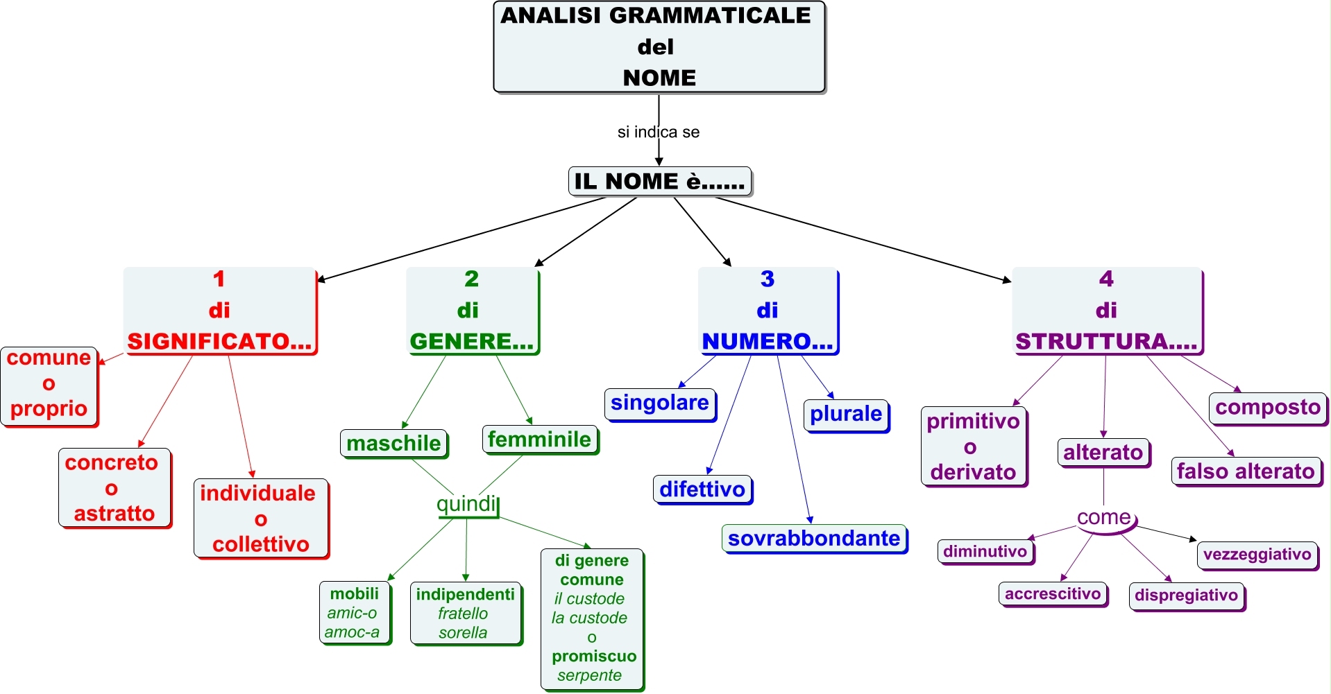 Questa Cmap, creata con IHMC CmapTools, contiene informazioni relative a: ANALISI GRAMMATICALE DEL NOME, IL NOME è...... 1 di SIGNIFICATO... concreto o astratto, femminile quindi mobili amic-o amoc-a, ANALISI GRAMMATICALE del NOME si indica se IL NOME è......, alterato come diminutivo, IL NOME è...... 4 di STRUTTURA.... alterato, femminile quindi di genere comune il custode la custode o promiscuo serpente, IL NOME è...... 2 di GENERE... maschile, IL NOME è...... 1 di SIGNIFICATO... comune o proprio, IL NOME è...... 3 di NUMERO... sovrabbondante, alterato come vezzeggiativo, alterato come accrescitivo, IL NOME è...... 3 di NUMERO... difettivo, IL NOME è...... 3 di NUMERO... plurale, IL NOME è...... 1 di SIGNIFICATO... individuale o collettivo, IL NOME è...... 4 di STRUTTURA.... primitivo o derivato, IL NOME è...... 3 di NUMERO... singolare, maschile quindi di genere comune il custode la custode o promiscuo serpente, alterato come dispregiativo, IL NOME è...... 4 di STRUTTURA.... composto, maschile quindi indipendenti fratello sorella