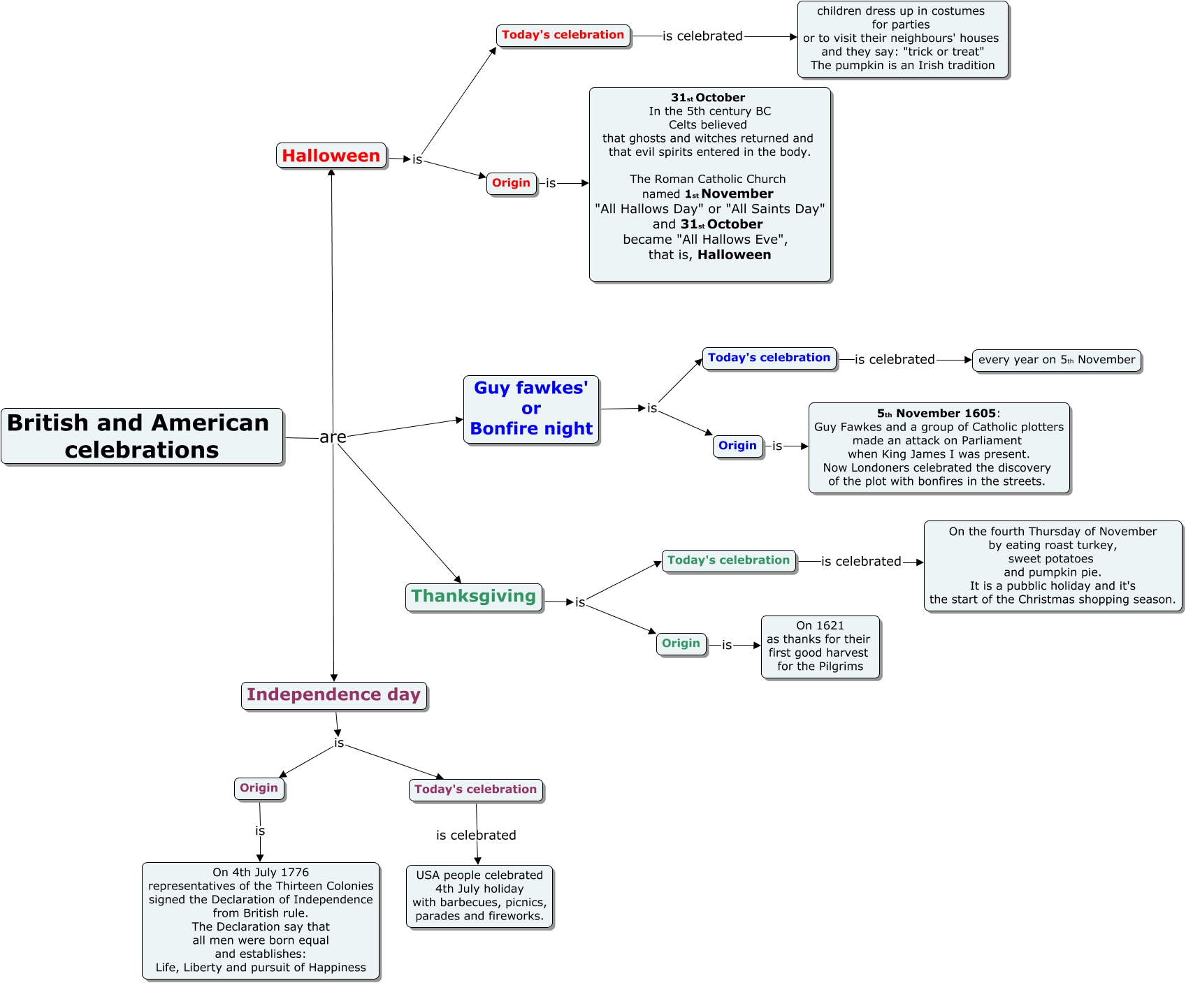 Questa Cmap, creata con IHMC CmapTools, contiene informazioni relative a: British and American celebrations 1, Origin is On 4th July 1776 representatives of the Thirteen Colonies signed the Declaration of Independence from British rule. The Declaration say that all men were born equal and establishes: Life, Liberty and pursuit of Happiness, Halloween is Origin, Independence day is Today's celebration, Origin is On 1621 as thanks for their first good harvest for the Pilgrims, Origin is 31st October In the 5th century BC Celts believed that ghosts and witches returned and that evil spirits entered in the body. The Roman Catholic Church named 1st November "All Hallows Day" or "All Saints Day" and 31st October became "All Hallows Eve", that is, Halloween, Guy fawkes' or Bonfire night is Today's celebration, Thanksgiving is Origin, British and American celebrations are Independence day, Guy fawkes' or Bonfire night is Origin, Independence day is Origin, British and American celebrations are Guy fawkes' or Bonfire night, British and American celebrations are Thanksgiving, Today's celebration is celebrated USA people celebrated 4th July holiday with barbecues, picnics, parades and fireworks., Origin is 5th November 1605: Guy Fawkes and a group of Catholic plotters made an attack on Parliament when King James I was present. Now Londoners celebrated the discovery of the plot with bonfires in the streets., Halloween is Today's celebration, Today's celebration is celebrated On the fourth Thursday of November by eating roast turkey, sweet potatoes and pumpkin pie. It is a pubblic holiday and it's the start of the Christmas shopping season., Thanksgiving is Today's celebration, British and American celebrations are Halloween, Today's celebration is celebrated every year on 5th November, Today's celebration is celebrated children dress up in costumes for parties or to visit their neighbours' houses and they say: "trick or treat" The pumpkin is an Irish tradition