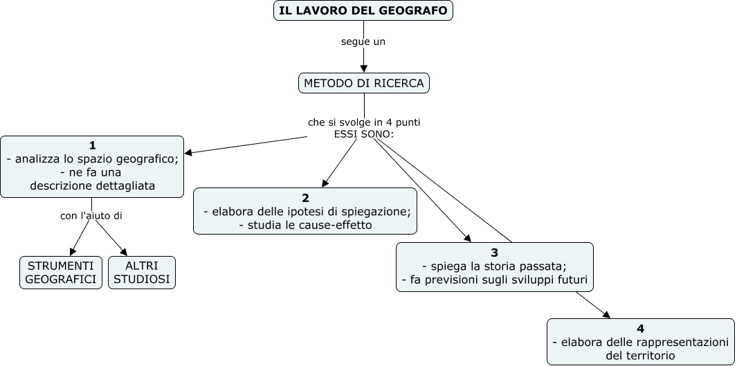 Questa Cmap, creata con IHMC CmapTools, contiene informazioni relative a: Il lavoro del geografo, METODO DI RICERCA che si svolge in 4 punti ESSI SONO: 1 - analizza lo spazio geografico; - ne fa una descrizione dettagliata, METODO DI RICERCA che si svolge in 4 punti ESSI SONO: 2 - elabora delle ipotesi di spiegazione; - studia le cause-effetto, 1 - analizza lo spazio geografico; - ne fa una descrizione dettagliata con l'aiuto di ALTRI STUDIOSI, METODO DI RICERCA che si svolge in 4 punti ESSI SONO: 4 - elabora delle rappresentazioni del territorio, IL LAVORO DEL GEOGRAFO segue un METODO DI RICERCA, 1 - analizza lo spazio geografico; - ne fa una descrizione dettagliata con l'aiuto di STRUMENTI GEOGRAFICI, METODO DI RICERCA che si svolge in 4 punti ESSI SONO: 3 - spiega la storia passata; - fa previsioni sugli sviluppi futuri