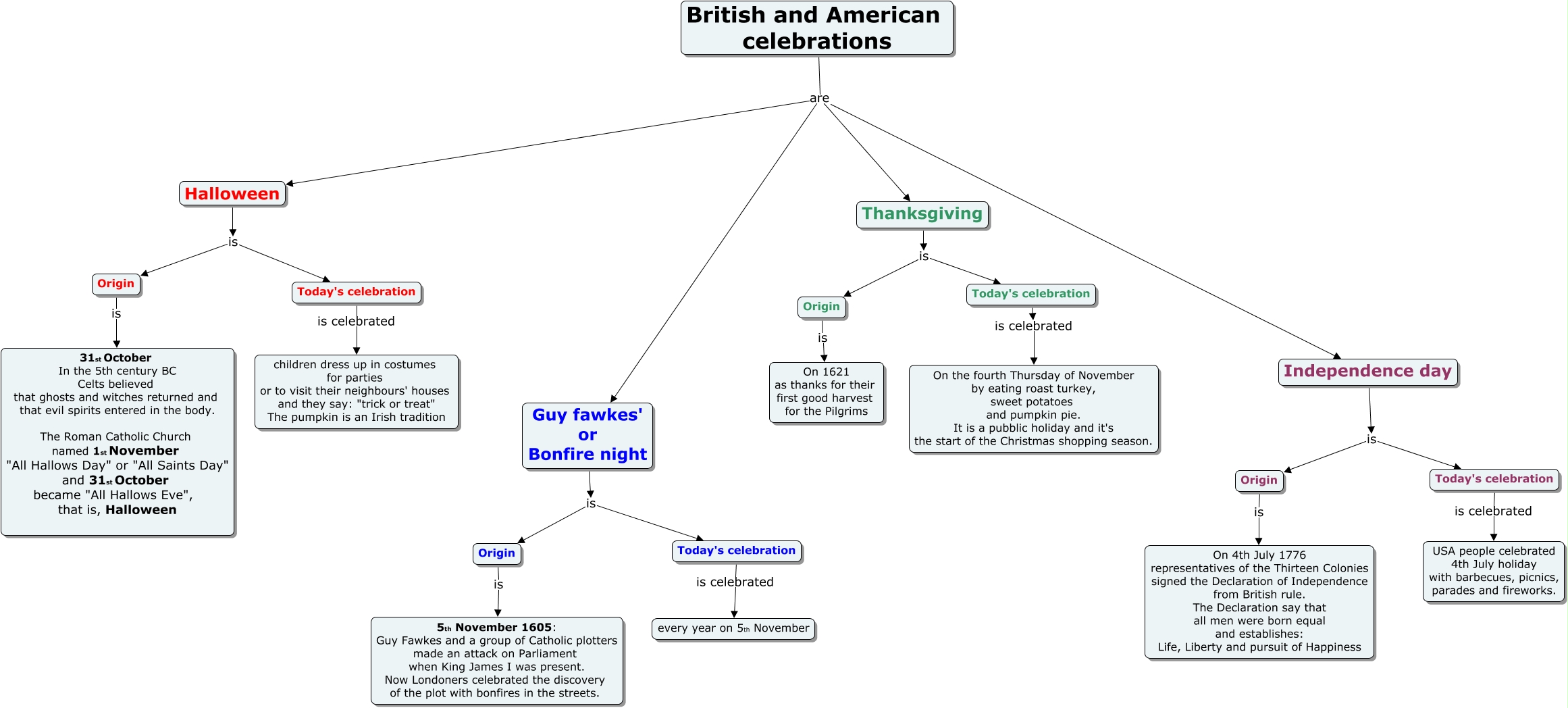 Questa Cmap, creata con IHMC CmapTools, contiene informazioni relative a: British and American celebrations, Origin is On 4th July 1776 representatives of the Thirteen Colonies signed the Declaration of Independence from British rule. The Declaration say that all men were born equal and establishes: Life, Liberty and pursuit of Happiness, Halloween is Origin, Independence day is Today's celebration, Origin is On 1621 as thanks for their first good harvest for the Pilgrims, Origin is 31st October In the 5th century BC Celts believed that ghosts and witches returned and that evil spirits entered in the body. The Roman Catholic Church named 1st November "All Hallows Day" or "All Saints Day" and 31st October became "All Hallows Eve", that is, Halloween, Thanksgiving is Origin, British and American celebrations are Independence day, Guy fawkes' or Bonfire night is Origin, Independence day is Origin, British and American celebrations are Guy fawkes' or Bonfire night, British and American celebrations are Thanksgiving, Today's celebration is celebrated USA people celebrated 4th July holiday with barbecues, picnics, parades and fireworks., Origin is 5th November 1605: Guy Fawkes and a group of Catholic plotters made an attack on Parliament when King James I was present. Now Londoners celebrated the discovery of the plot with bonfires in the streets., Halloween is Today's celebration, Today's celebration is celebrated On the fourth Thursday of November by eating roast turkey, sweet potatoes and pumpkin pie. It is a pubblic holiday and it's the start of the Christmas shopping season., Thanksgiving is Today's celebration, Guy fawkes' or Bonfire night is Today's celebration, British and American celebrations are Halloween, Today's celebration is celebrated every year on 5th November, Today's celebration is celebrated children dress up in costumes for parties or to visit their neighbours' houses and they say: "trick or treat" The pumpkin is an Irish tradition