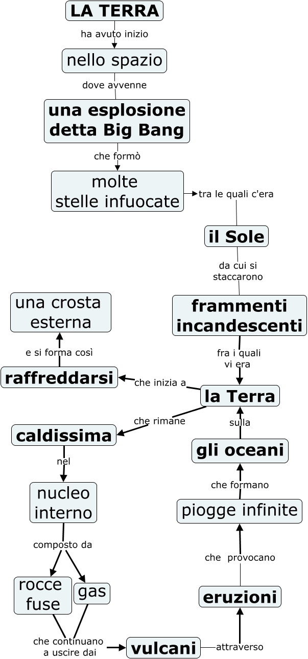 Questa Cmap, creata con IHMC CmapTools, contiene informazioni relative a: BIG BANG, una esplosione detta Big Bang che formò molte stelle infuocate, eruzioni che provocano piogge infinite, la Terra che rimane caldissima, raffreddarsi e si forma così una crosta esterna, gas che continuano a uscire dai vulcani, il Sole da cui si staccarono frammenti incandescenti, nello spazio dove avvenne una esplosione detta Big Bang, vulcani attraverso eruzioni, molte stelle infuocate tra le quali c'era il Sole, nucleo interno composto da gas, piogge infinite che formano gli oceani, LA TERRA ha avuto inizio nello spazio, la Terra che inizia a raffreddarsi, frammenti incandescenti fra i quali vi era la Terra, nucleo interno composto da rocce fuse, caldissima nel nucleo interno, rocce fuse che continuano a uscire dai vulcani