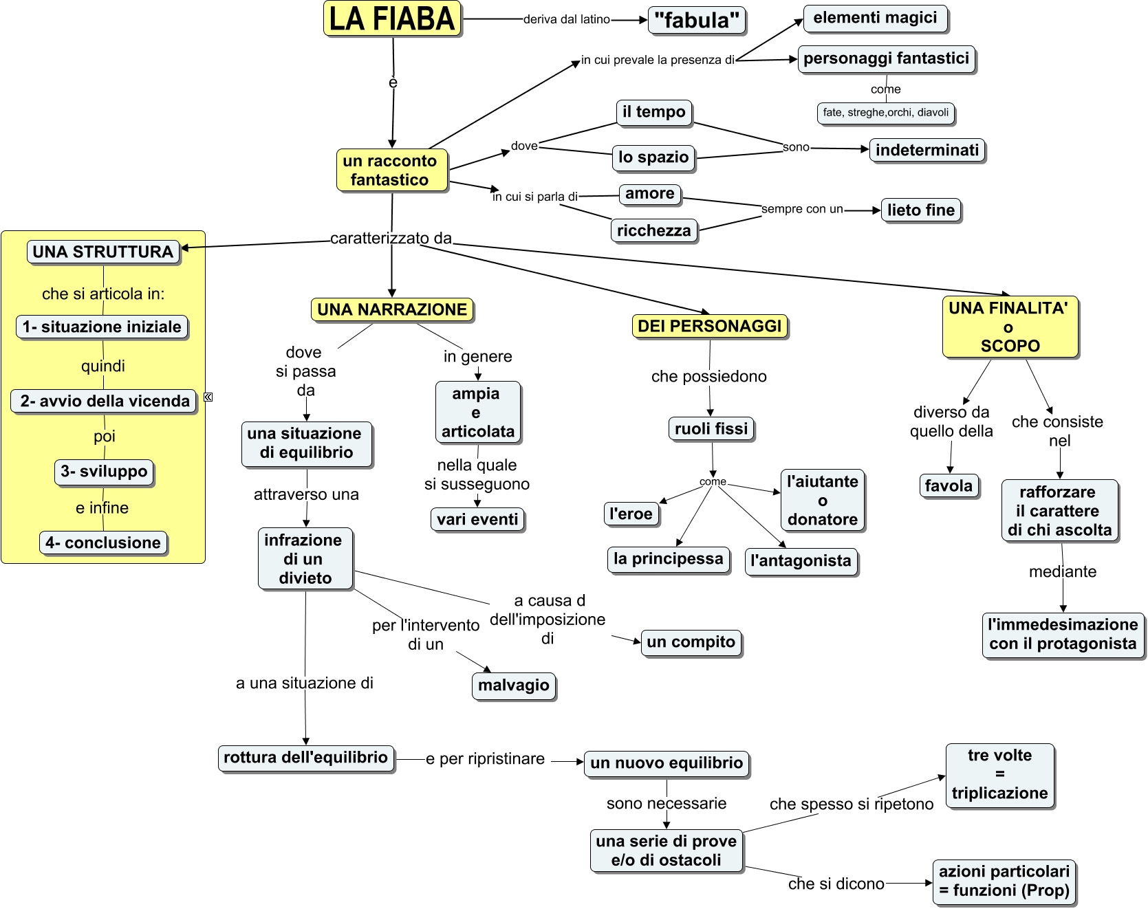 Questa Cmap, creata con IHMC CmapTools, contiene informazioni relative a: LA FIABA, ruoli fissi come l'eroe, un racconto fantastico in cui prevale la presenza di elementi magici, un racconto fantastico in cui si parla di ricchezza, amore sempre con un lieto fine, 1- situazione iniziale quindi 2- avvio della vicenda, DEI PERSONAGGI che possiedono ruoli fissi, UNA STRUTTURA che si articola in: 1- situazione iniziale, amore sempre con un ricchezza, un nuovo equilibrio sono necessarie una serie di prove e/o di ostacoli, LA FIABA deriva dal latino "fabula", un racconto fantastico caratterizzato da UNA NARRAZIONE, un racconto fantastico caratterizzato da DEI PERSONAGGI, UNA NARRAZIONE in genere ampia e articolata, personaggi fantastici come fate, streghe,orchi, diavoli, un racconto fantastico in cui prevale la presenza di personaggi fantastici, UNA NARRAZIONE dove si passa da una situazione di equilibrio, infrazione di un divieto a una situazione di rottura dell'equilibrio, il tempo sono indeterminati, un racconto fantastico caratterizzato da UNA FINALITA' o SCOPO, UNA FINALITA' o SCOPO che consiste nel rafforzare il carattere di chi ascolta