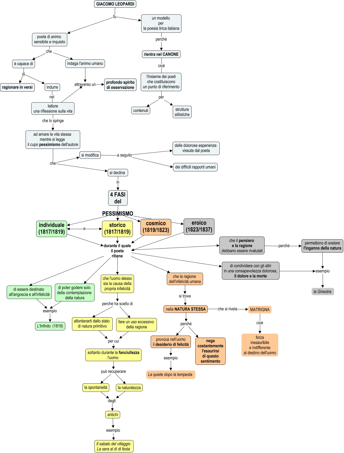 Questa Cmap, creata con IHMC CmapTools, contiene informazioni relative a: Giacomo Leopardi, individuale (1817/1819) durante il quale il poeta ritiene che la ragione dell'infelicità umana, indaga l'animo umano attraverso un profondo spirito di osservazione, che l'uomo stesso sia la causa della propria infelicità perchè ha scelto di allontanarti dallo stato di natura primitivo, eroico (1823/1837) durante il quale il poeta ritiene di essere destinato all'angoscia e all'infelicità, 4 FASI del PESSIMISMO cosmico (1819/1823), si modifica a seguito dei difficili rapporti umani, storico (1817/1819) durante il quale il poeta ritiene di condividere con gli altri in una consapevolezza dolorosa, il dolore e la morte, eroico (1823/1837) durante il quale il poeta ritiene che il pensiero e la ragione debbano essere rivalutati, storico (1817/1819) durante il quale il poeta ritiene di poter godere solo della contemplazione della natura, individuale (1817/1819) durante il quale il poeta ritiene di condividere con gli altri in una consapevolezza dolorosa, il dolore e la morte, GIACOMO LEOPARDI fu poeta di animo sensibile e inquieto, 4 FASI del PESSIMISMO storico (1817/1819), eroico (1823/1837) durante il quale il poeta ritiene di condividere con gli altri in una consapevolezza dolorosa, il dolore e la morte, storico (1817/1819) durante il quale il poeta ritiene che l'uomo stesso sia la causa della propria infelicità, di condividere con gli altri in una consapevolezza dolorosa, il dolore e la morte esempio la Ginestra, GIACOMO LEOPARDI fu un modello per la poesia lirica italiana, cosmico (1819/1823) durante il quale il poeta ritiene di essere destinato all'angoscia e all'infelicità, ad amare la vita stessa mentre si legge il cupo pessimismo dell'autore che si declina, provoca nell'uomo il desiderio di felicità esempio La quiete dopo la tempesta, storico (1817/1819) durante il quale il poeta ritiene di essere destinato all'angoscia e all'infelicità