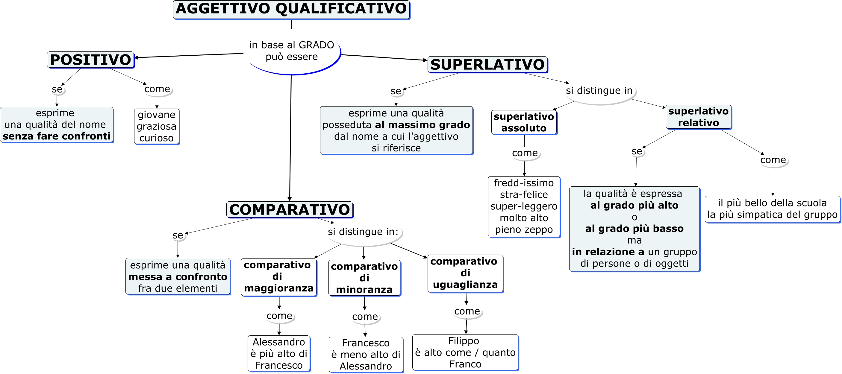 Questa Cmap, creata con IHMC CmapTools, contiene informazioni relative a: AGGETTIVI QUALIFICATIVI in base al grado, comparativo di minoranza come Francesco è meno alto di Alessandro, comparativo di uguaglianza come Filippo è alto come / quanto Franco, COMPARATIVO si distingue in: comparativo di minoranza, COMPARATIVO se esprime una qualità messa a confronto fra due elementi, POSITIVO come giovane graziosa curioso, COMPARATIVO si distingue in: comparativo di uguaglianza, comparativo di maggioranza come Alessandro è più alto di Francesco, SUPERLATIVO si distingue in superlativo assoluto, superlativo relativo se la qualità è espressa al grado più alto o al grado più basso ma in relazione a un gruppo di persone o di oggetti, COMPARATIVO si distingue in: comparativo di maggioranza, AGGETTIVO QUALIFICATIVO in base al GRADO può essere COMPARATIVO, superlativo relativo come il più bello della scuola la più simpatica del gruppo, SUPERLATIVO se esprime una qualità posseduta al massimo grado dal nome a cui l'aggettivo si riferisce, AGGETTIVO QUALIFICATIVO in base al GRADO può essere SUPERLATIVO, AGGETTIVO QUALIFICATIVO in base al GRADO può essere POSITIVO, SUPERLATIVO si distingue in superlativo relativo, POSITIVO se esprime una qualità del nome senza fare confronti, superlativo assoluto come fredd-issimo stra-felice super-leggero molto alto pieno zeppo