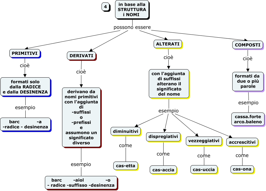 Questa Cmap, creata con IHMC CmapTools, contiene informazioni relative a: NOME 4 STRUTTURA, con l'aggiunta di suffissi alterano il significato del nome esempio dispregiativi, diminuitivi come cas-etta, DERIVATI cioè derivano da nomi primitivi con l'aggiunta di -suffissi o -prefissi e assumono un significato diverso, con l'aggiunta di suffissi alterano il significato del nome esempio vezzeggiativi, con l'aggiunta di suffissi alterano il significato del nome esempio diminuitivi, COMPOSTI cioè formati da due o più parole, con l'aggiunta di suffissi alterano il significato del nome esempio accrescitivi, in base alla STRUTTURA i NOMI possono essere PRIMITIVI, in base alla STRUTTURA i NOMI possono essere DERIVATI, vezzeggiativi come cas-uccia, derivano da nomi primitivi con l'aggiunta di -suffissi o -prefissi e assumono un significato diverso esempio barc -aiol -o - radice -suffisso -desinenza, dispregiativi come cas-accia, accrescitivi come cas-ona, in base alla STRUTTURA i NOMI possono essere COMPOSTI, in base alla STRUTTURA i NOMI possono essere ALTERATI, formati da due o più parole esempio cassa.forte arco.baleno, ALTERATI cioè con l'aggiunta di suffissi alterano il significato del nome, formati solo dalla RADICE e dalla DESINENZA esempio barc -a -radice - desinenza, PRIMITIVI cioè formati solo dalla RADICE e dalla DESINENZA
