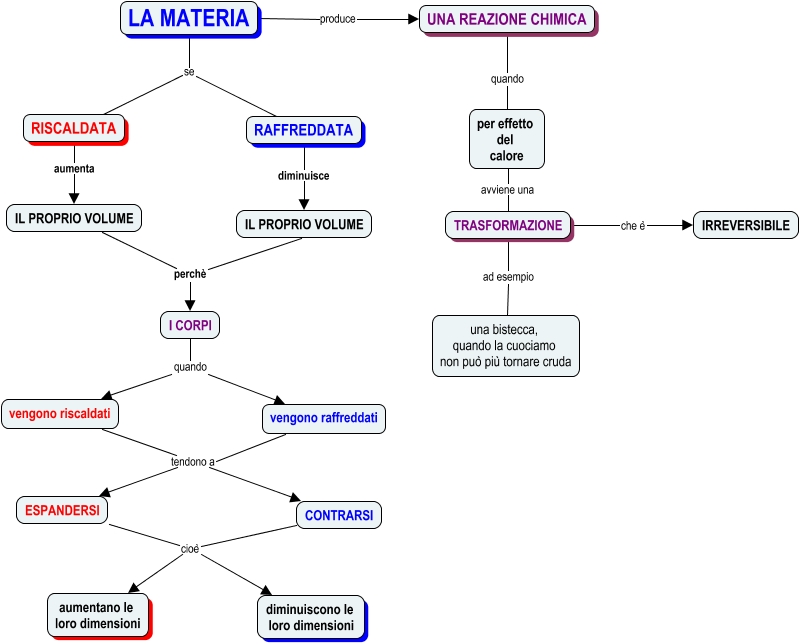 Questa Cmap, creata con IHMC CmapTools, contiene informazioni relative a: EFFETTI de CALORE sulla MATERIA, RAFFREDDATA diminuisce IL PROPRIO VOLUME, LA MATERIA se RISCALDATA, vengono raffreddati tendono a ESPANDERSI, IL PROPRIO VOLUME perchè IL PROPRIO VOLUME, LA MATERIA se RAFFREDDATA, UNA REAZIONE CHIMICA quando per effetto del calore, per effetto del calore avviene una TRASFORMAZIONE, vengono riscaldati tendono a CONTRARSI, TRASFORMAZIONE ad esempio una bistecca, quando la cuociamo non può più tornare cruda, TRASFORMAZIONE che è IRREVERSIBILE, vengono raffreddati tendono a CONTRARSI, ESPANDERSI cioè diminuiscono le loro dimensioni, RISCALDATA aumenta IL PROPRIO VOLUME, I CORPI quando vengono raffreddati, LA MATERIA produce UNA REAZIONE CHIMICA, CONTRARSI cioè aumentano le loro dimensioni, I CORPI quando vengono riscaldati, CONTRARSI cioè diminuiscono le loro dimensioni, IL PROPRIO VOLUME perchè I CORPI, vengono riscaldati tendono a ESPANDERSI