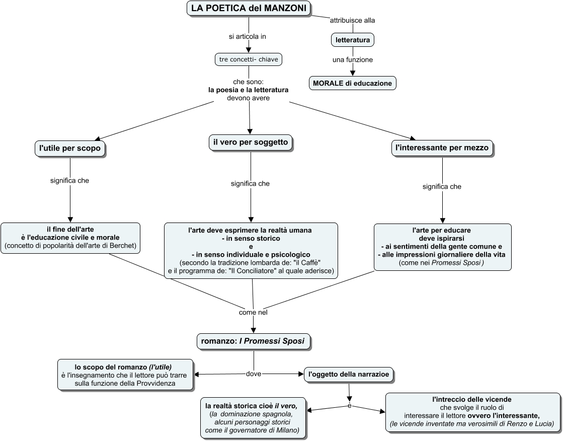Questa Cmap, creata con IHMC CmapTools, contiene informazioni relative a: La poetica del Manzoni, il fine dell'arte è l'educazione civile e morale (concetto di popolarità dell'arte di Berchet) come nel romanzo: I Promessi Sposi, tre concetti- chiave che sono: la poesia e la letteratura devono avere l'interessante per mezzo, il fine dell'arte è l'educazione civile e morale (concetto di popolarità dell'arte di Berchet) come nel l'arte deve esprimere la realtà umana - in senso storico e - in senso individuale e psicologico (secondo la tradizione lombarda de: "il Caffè" e il programma de: "Il Conciliatore" al quale aderisce), tre concetti- chiave che sono: la poesia e la letteratura devono avere l'utile per scopo, LA POETICA del MANZONI attribuisce alla letteratura, l'interessante per mezzo significa che l'arte per educare deve ispirarsi - ai sentimenti della gente comune e - alle impressioni giornaliere della vita (come nei Promessi Sposi), l'oggetto della narrazioe è l'intreccio delle vicende che svolge il ruolo di interessare il lettore ovvero l'interessante, (le vicende inventate ma verosimili di Renzo e Lucia), il vero per soggetto significa che l'arte deve esprimere la realtà umana - in senso storico e - in senso individuale e psicologico (secondo la tradizione lombarda de: "il Caffè" e il programma de: "Il Conciliatore" al quale aderisce), romanzo: I Promessi Sposi dove l'oggetto della narrazioe, l'utile per scopo significa che il fine dell'arte è l'educazione civile e morale (concetto di popolarità dell'arte di Berchet), tre concetti- chiave che sono: la poesia e la letteratura devono avere il vero per soggetto, l'oggetto della narrazioe è la realtà storica cioè il vero, (la dominazione spagnola, alcuni personaggi storici come il governatore di Milano), il fine dell'arte è l'educazione civile e morale (concetto di popolarità dell'arte di Berchet) come nel l'arte per educare deve ispirarsi - ai sentimenti della gente comune e - alle impressioni giornaliere della vita (come nei Promessi Sposi), LA POETICA del MANZONI si articola in tre concetti- chiave, romanzo: I Promessi Sposi dove lo scopo del romanzo (l'utile) è l'insegnamento che il lettore può trarre sulla funzione della Provvidenza, letteratura una funzione MORALE di educazione