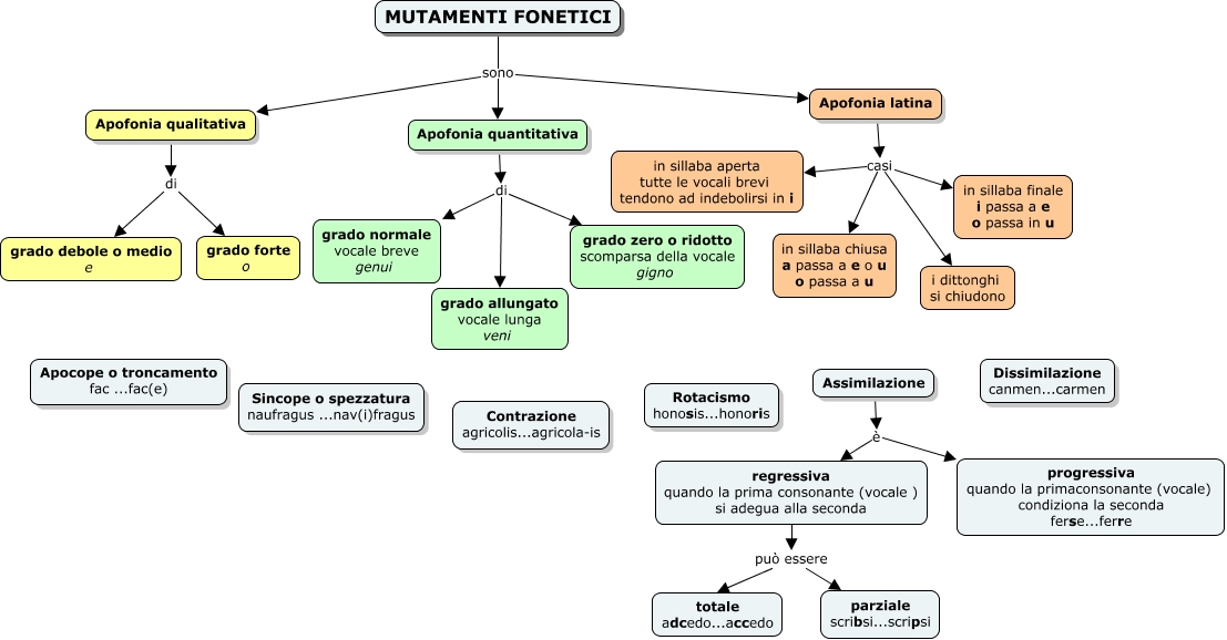Questa Cmap, creata con IHMC CmapTools, contiene informazioni relative a: MUTAMENTI FONETICI, MUTAMENTI FONETICI sono Apofonia quantitativa, regressiva quando la prima consonante (vocale ) si adegua alla seconda può essere parziale scribsi...scripsi, Apofonia quantitativa di grado zero o ridotto scomparsa della vocale gigno, Apofonia latina casi in sillaba finale i passa a e o passa in u, Apofonia quantitativa di grado normale vocale breve genui, MUTAMENTI FONETICI sono Apofonia qualitativa, regressiva quando la prima consonante (vocale ) si adegua alla seconda può essere totale adcedo...accedo, Assimilazione è progressiva quando la primaconsonante (vocale) condiziona la seconda ferse...ferre, Apofonia latina casi in sillaba chiusa a passa a e o u o passa a u, Apofonia latina casi in sillaba aperta tutte le vocali brevi tendono ad indebolirsi in i, MUTAMENTI FONETICI sono Apofonia latina, Apofonia qualitativa di grado debole o medio e, Assimilazione è regressiva quando la prima consonante (vocale ) si adegua alla seconda, Apofonia latina casi i dittonghi si chiudono, Apofonia quantitativa di grado allungato vocale lunga veni, Apofonia qualitativa di grado forte o
