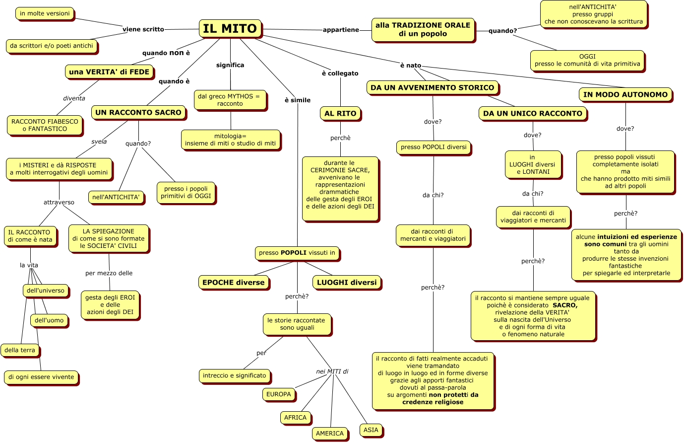 Questa Cmap, creata con IHMC CmapTools, contiene informazioni relative a: MITO, IL RACCONTO di come è nata la vita dell'universo, presso POPOLI vissuti in ???? EPOCHE diverse, le storie raccontate sono uguali nei MITI di AFRICA, una VERITA' di FEDE diventa RACCONTO FIABESCO o FANTASTICO, DA UN UNICO RACCONTO dove? in LUOGHI diversi e LONTANI, dai racconti di viaggiatori e mercanti perchè? il racconto si mantiene sempre uguale poichè è considerato SACRO, rivelazione della VERITA' sulla nascita dell'Universo e di ogni forma di vita o fenomeno naturale, le storie raccontate sono uguali nei MITI di ASIA, IL RACCONTO di come è nata la vita di ogni essere vivente, IL MITO viene scritto da scrittori e/o poeti antichi, IL MITO è simile presso POPOLI vissuti in, IL MITO è nato DA UN UNICO RACCONTO, IL MITO significa mitologia= insieme di miti o studio di miti, IL MITO è nato IN MODO AUTONOMO, presso POPOLI vissuti in perchè? le storie raccontate sono uguali, DA UN AVVENIMENTO STORICO dove? presso POPOLI diversi, le storie raccontate sono uguali nei MITI di EUROPA, IL MITO è collegato AL RITO, IN MODO AUTONOMO dove? presso popoli vissuti completamente isolati ma che hanno prodotto miti simili ad altri popoli, le storie raccontate sono uguali nei MITI di AMERICA, presso popoli vissuti completamente isolati ma che hanno prodotto miti simili ad altri popoli perchè? alcune intuizioni ed esperienze sono comuni tra gli uomini tanto da produrre le stesse invenzioni fantastiche per spiegarle ed interpretarle