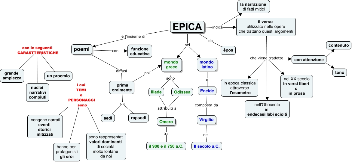 Questa Cmap, creata con IHMC CmapTools, contiene informazioni relative a: EPICA, prima oralmente da rapsodi, Omero tra il 900 e il 750 a.C., poemi con le seguenti CARASTTERISTICHE grande ampiezza, prima oralmente poi mondo greco, EPICA nel mondo latino, Virgilio nel II secolo a.C., EPICA è l'insieme di poemi, mondo greco sono Iliade, il verso utilizzato nelle opere che trattano questi argomenti che viene tradotto nell'Ottocento in endecasillabi sciolti, Odissea attribuiti a Omero, mondo latino è Eneide, EPICA da èpos, prima oralmente da aedi, poemi i cui TEMI e PERSONAGGI sono hanno per protagonisti gli eroi, Eneide composta da Virgilio, il verso utilizzato nelle opere che trattano questi argomenti che viene tradotto in epoca classica attraverso l'esametro, poemi i cui TEMI e PERSONAGGI sono sono rappresentati valori dominanti di società molto lontane da noi, poemi diffusi prima oralmente, con attenzione al tono, EPICA indica la narrazione di fatti mitici