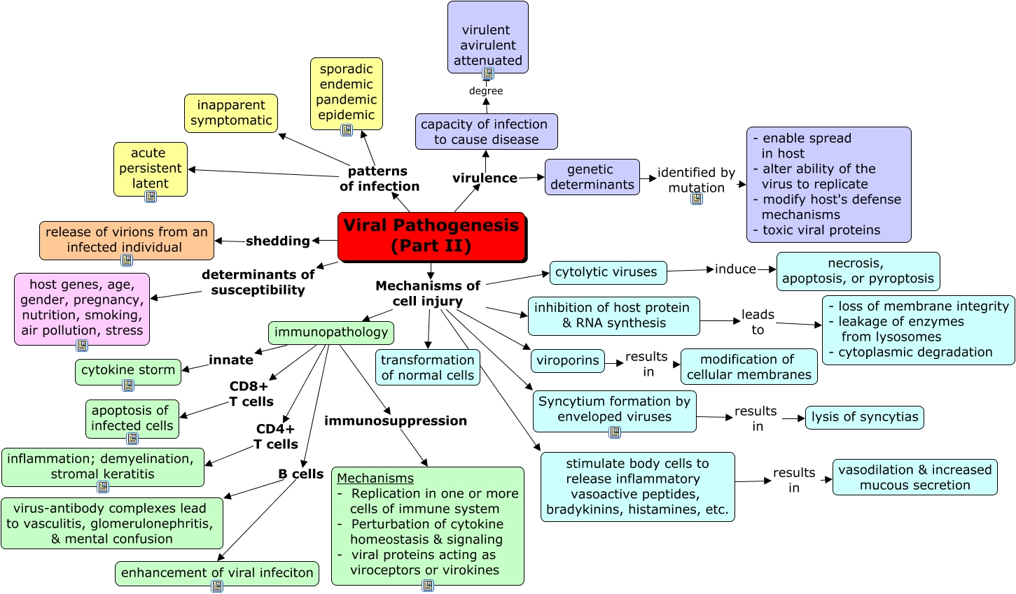 This Concept Map, created with IHMC CmapTools, has information related to: Viral pathogenesis part 2, immunopathology B cells enhancement of viral infeciton, Viral Pathogenesis (Part II) Mechanisms of cell injury transformation of normal cells, Viral Pathogenesis (Part II) Mechanisms of cell injury immunopathology, Viral Pathogenesis (Part II) Mechanisms of cell injury inhibition of host protein & RNA synthesis, Viral Pathogenesis (Part II) shedding release of virions from an infected individual, Viral Pathogenesis (Part II) Mechanisms of cell injury viroporins, stimulate body cells to release inflammatory vasoactive peptides, bradykinins, histamines, etc. results in vasodilation & increased mucous secretion, inhibition of host protein & RNA synthesis leads to - loss of membrane integrity - leakage of enzymes from lysosomes - cytoplasmic degradation, Syncytium formation by enveloped viruses results in lysis of syncytias, cytolytic viruses induce necrosis, apoptosis, or pyroptosis, viroporins results in modification of cellular membranes, Viral Pathogenesis (Part II) virulence capacity of infection to cause disease, Viral Pathogenesis (Part II) Mechanisms of cell injury Syncytium formation by enveloped viruses, Viral Pathogenesis (Part II) virulence genetic determinants, immunopathology innate cytokine storm, Viral Pathogenesis (Part II) patterns of infection sporadic endemic pandemic epidemic, immunopathology CD8+ T cells apoptosis of infected cells, immunopathology B cells virus-antibody complexes lead to vasculitis, glomerulonephritis, & mental confusion, capacity of infection to cause disease degree virulent avirulent attenuated, Viral Pathogenesis (Part II) determinants of susceptibility host genes, age, gender, pregnancy, nutrition, smoking, air pollution, stress