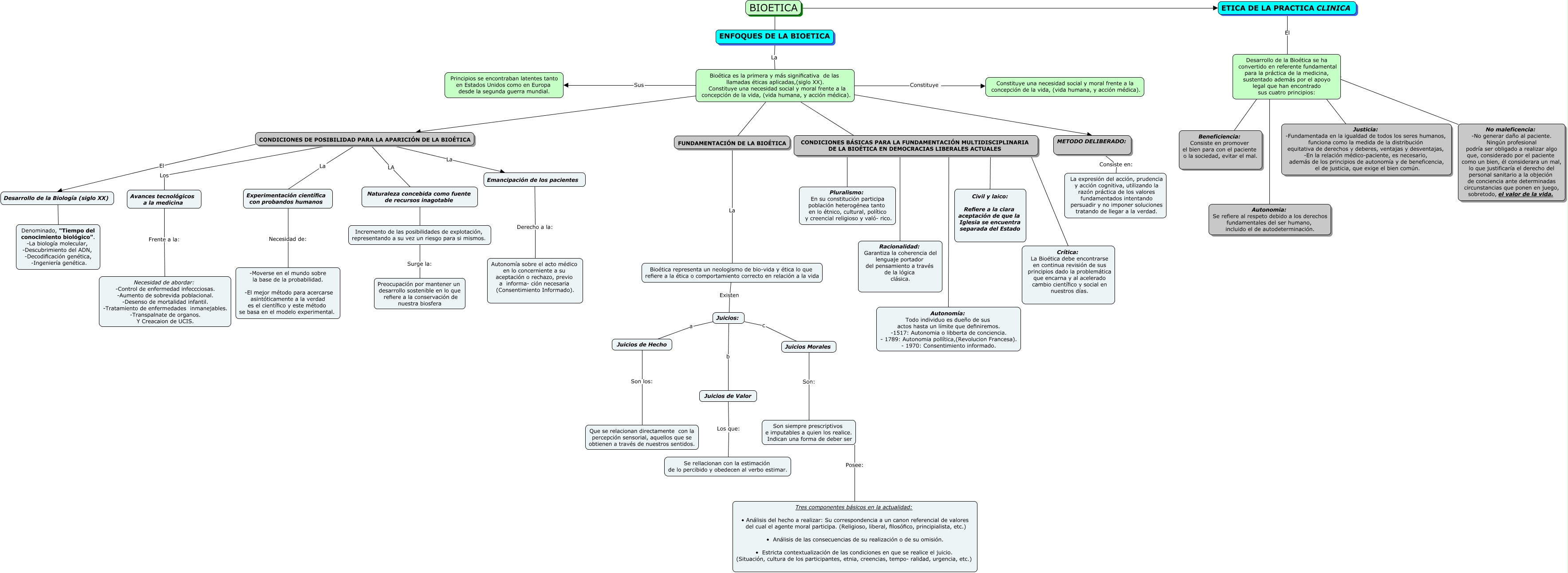 Este Cmap, tiene información relacionada con: MAPA CONCEPTUAL DE LOS ENFOQUES DE LA BIOETICA_FREDDY ESPAÑA, Incremento de las posibilidades de explotación, representando a su vez un riesgo para si mismos. Surge la: Preocupación por mantener un desarrollo sostenible en lo que refiere a la conservación de nuestra biosfera, Bioética es la primera y más significativa de las llamadas éticas aplicadas,(siglo XX). Constituye una necesidad social y moral frente a la concepción de la vida, (vida humana, y acción médica). ???? METODO DELIBERADO:, ETICA DE LA PRACTICA CLINICA El Desarrollo de la Bioética se ha convertido en referente fundamental para la práctica de la medicina, sustentado además por el apoyo legal que han encontrado sus cuatro principios:, CONDICIONES BÁSICAS PARA LA FUNDAMENTACIÓN MULTIDISCIPLINARIA DE LA BIOÉTICA EN DEMOCRACIAS LIBERALES ACTUALES ???? Pluralismo: En su constitución participa población heterogénea tanto en lo étnico, cultural, político y creencial religioso y való- rico., Bioética es la primera y más significativa de las llamadas éticas aplicadas,(siglo XX). Constituye una necesidad social y moral frente a la concepción de la vida, (vida humana, y acción médica). Sus Principios se encontraban latentes tanto en Estados Unidos como en Europa desde la segunda guerra mundial., Experimentación científica con probandos humanos Necesidad de: -Moverse en el mundo sobre la base de la probabilidad. -El mejor método para acercarse asintóticamente a la verdad es el científico y este método se basa en el modelo experimental., CONDICIONES BÁSICAS PARA LA FUNDAMENTACIÓN MULTIDISCIPLINARIA DE LA BIOÉTICA EN DEMOCRACIAS LIBERALES ACTUALES ???? Civil y laico: Refiere a la clara aceptación de que la Iglesia se encuentra separada del Estado, CONDICIONES DE POSIBILIDAD PARA LA APARICIÓN DE LA BIOÉTICA La Emancipación de los pacientes, Juicios: b Juicios de Valor, Juicios: a Juicios de Hecho, Desarrollo de la Bioética se ha convertido en referente fundamental para la práctica de la medicina, sustentado además por el apoyo legal que han encontrado sus cuatro principios: ???? No maleficencia: -No generar daño al paciente. Ningún profesional podría ser obligado a realizar algo que, considerado por el paciente como un bien, él considerara un mal, lo que justificaría el derecho del personal sanitario a la objeción de conciencia ante determinadas circunstancias que ponen en juego, sobretodo, el valor de la vida., CONDICIONES DE POSIBILIDAD PARA LA APARICIÓN DE LA BIOÉTICA Los Avances tecnológicos a la medicina, CONDICIONES DE POSIBILIDAD PARA LA APARICIÓN DE LA BIOÉTICA La Experimentación científica con probandos humanos, Bioética es la primera y más significativa de las llamadas éticas aplicadas,(siglo XX). Constituye una necesidad social y moral frente a la concepción de la vida, (vida humana, y acción médica). ???? FUNDAMENTACIÓN DE LA BIOÉTICA, Desarrollo de la Bioética se ha convertido en referente fundamental para la práctica de la medicina, sustentado además por el apoyo legal que han encontrado sus cuatro principios: ???? Autonomia: Se refiere al respeto debido a los derechos fundamentales del ser humano, incluido el de autodeterminación., Emancipación de los pacientes Derecho a la: Autonomía sobre el acto médico en lo concerniente a su aceptación o rechazo, previo a informa- ción necesaria (Consentimiento Informado)., METODO DELIBERADO: Consiste en: La expresión del acción, prudencia y acción cognitiva, utilizando la razón práctica de los valores fundamentados intentando persuadir y no imponer soluciones tratando de llegar a la verdad., Bioética es la primera y más significativa de las llamadas éticas aplicadas,(siglo XX). Constituye una necesidad social y moral frente a la concepción de la vida, (vida humana, y acción médica). ???? CONDICIONES BÁSICAS PARA LA FUNDAMENTACIÓN MULTIDISCIPLINARIA DE LA BIOÉTICA EN DEMOCRACIAS LIBERALES ACTUALES, ENFOQUES DE LA BIOETICA La Bioética es la primera y más significativa de las llamadas éticas aplicadas,(siglo XX). Constituye una necesidad social y moral frente a la concepción de la vida, (vida humana, y acción médica)., CONDICIONES DE POSIBILIDAD PARA LA APARICIÓN DE LA BIOÉTICA El Desarrollo de la Biología (siglo XX)
