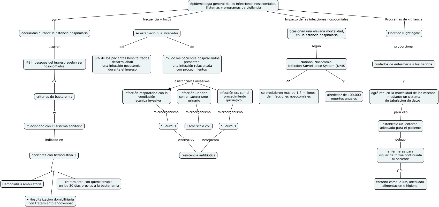 Este Cmap, tiene información relacionada con: epidemiolgia, S. aureus incremento resistencia antibiotica, infección cx, con el procedimiento quirúrgico, microorganismo S. aureus, establecio un entorno adecuado para el paciente delego enfermeras para vigilar de forma continuada al paciente, criterios de bacteremia se relacionana con el sistema sanitario, Epidemiología general de las infecciones nosocomiales. Sistemas y programas de vigilancia frecuencia y focos se estableció que alrededor, 7% de los pacientes hospitalizados presentan una infección relacionada con procedimientos asistenciales invasivos infección urinaria con el cateterismo urinario, se estableció que alrededor de 7% de los pacientes hospitalizados presentan una infección relacionada con procedimientos, relacionana con el sistema sanitario indicado en pacientes con hemocultivo +, adquiridas durante la estancia hospitalaria ocurren 48 h después del ingreso suelen ser nosocomiales., National Nosocomial Infection Surveillance System (NNIS y alrededor de 100.000 muertes anuales, ocasionan una elevada mortalidad, en la estancia hospitalaria segun National Nosocomial Infection Surveillance System (NNIS, pacientes con hemocultivo + son Hemodiálisis ambulatoria, Epidemiología general de las infecciones nosocomiales. Sistemas y programas de vigilancia Programas de vigilancia Florence Nightingale, infección respiratoria con la ventilación mecánica invasiva microorganismo S. aureus, Florence Nightingale proporciona cuidados de enfermería a los heridos, infección urinaria con el cateterismo urinario microorganismo Escherichia coli, Epidemiología general de las infecciones nosocomiales. Sistemas y programas de vigilancia Impacto de las infecciones nosocomiales ocasionan una elevada mortalidad, en la estancia hospitalaria, pacientes con hemocultivo + son Tratamiento con quimioterapia en los 30 días previos a la bacteriemia, S. aureus progresivo resistencia antibiotica, Epidemiología general de las infecciones nosocomiales. Sistemas y programas de vigilancia son adquiridas durante la estancia hospitalaria
