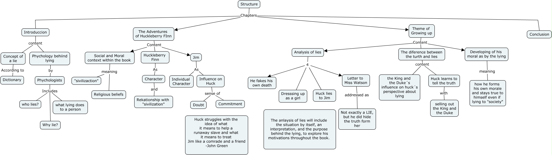 Este Cmap, tiene información relacionada con: Structure, Phychologists Includes who lies?, Concept of a lie According to Dictionary, The Adventures of Huckleberry FInn Content Huckleberry Finn, Developing of his moral as by the lying meaning how he forms his own morale and stays true to himself even if lying to "society", Phychologists Includes Why lie?, Theme of Growing up Content The diference between the turth and lies, Huckleberry Finn As Character, The Adventures of Huckleberry FInn Content Social and Moral context within the book, Phychologists Includes what lying does to a person, Structure Chapters The Adventures of Huckleberry FInn, Analysis of lies 4 Dresssing up as a girl, Analysis of lies 4 He fakes his own death, Huck learns to tell the truth with selling out the King and the Duke, Theme of Growing up Content Developing of his moral as by the lying, Character and Rekationship with "sivilization", Jim As Individual Character, The diference between the turth and lies content the King and the Duke´s influence on huck´s perspective about lying, Introduccion content Concept of a lie, Analysis of lies 4 Huck lies to Jim, Structure Chapters Theme of Growing up