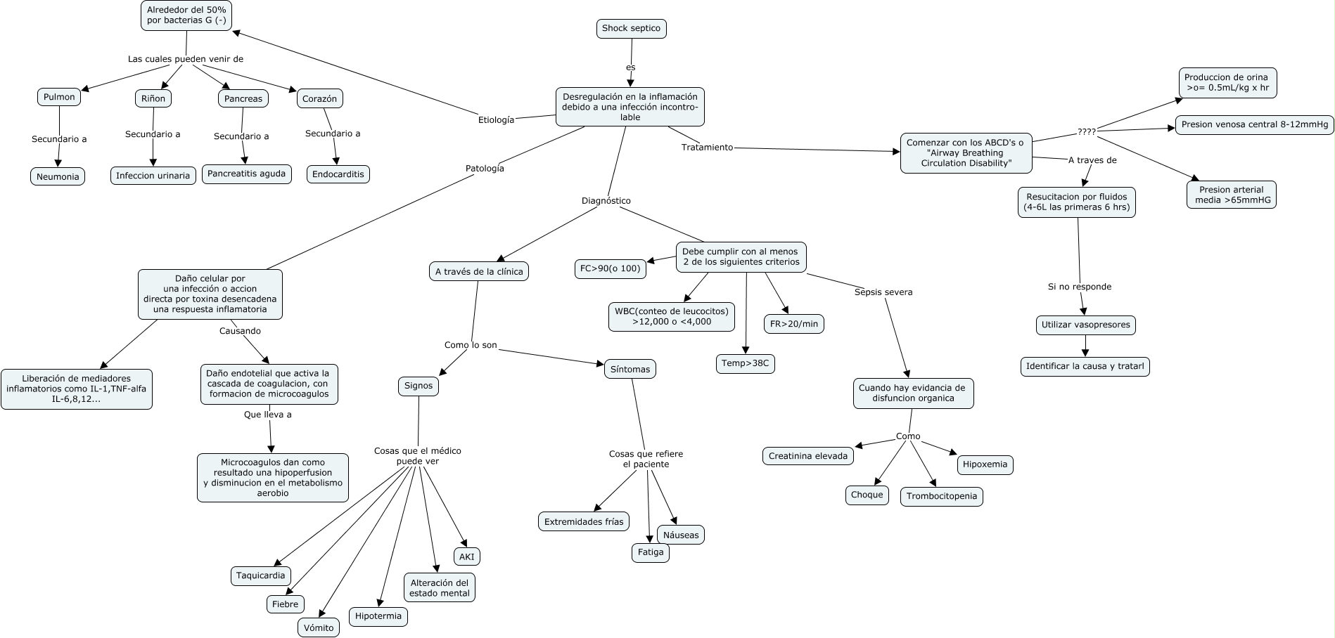 Este Cmap, tiene información relacionada con: Mapa IV, Debe cumplir con al menos 2 de los siguientes criterios ???? FCᢒ(o 100), Utilizar vasopresores a Identificar la causa y tratarl, Cuando hay evidancia de disfuncion organica Como Choque, Daño endotelial que activa la cascada de coagulacion, con formacion de microcoagulos Que lleva a Microcoagulos dan como resultado una hipoperfusion y disminucion en el metabolismo aerobio, A través de la clínica Como lo son Síntomas, Corazón Secundario a Endocarditis, Alrededor del 50% por bacterias G (-) Las cuales pueden venir de Corazón, Síntomas Cosas que refiere el paciente Náuseas, Riñon Secundario a Infeccion urinaria, Desregulación en la inflamación debido a una infección incontro- lable Etiología Alrededor del 50% por bacterias G (-), Signos Cosas que el médico puede ver Vómito, Comenzar con los ABCD's o "Airway Breathing Circulation Disability" A traves de Resucitacion por fluidos (4-6L las primeras 6 hrs), Desregulación en la inflamación debido a una infección incontro- lable Diagnóstico Debe cumplir con al menos 2 de los siguientes criterios, Comenzar con los ABCD's o "Airway Breathing Circulation Disability" ???? Presion venosa central 8-12mmHg, Cuando hay evidancia de disfuncion organica Como Trombocitopenia, Signos Cosas que el médico puede ver Fiebre, Alrededor del 50% por bacterias G (-) Las cuales pueden venir de Riñon, Desregulación en la inflamación debido a una infección incontro- lable Diagnóstico A través de la clínica, Debe cumplir con al menos 2 de los siguientes criterios ???? TempᡞC, Desregulación en la inflamación debido a una infección incontro- lable Tratamiento Comenzar con los ABCD's o "Airway Breathing Circulation Disability"