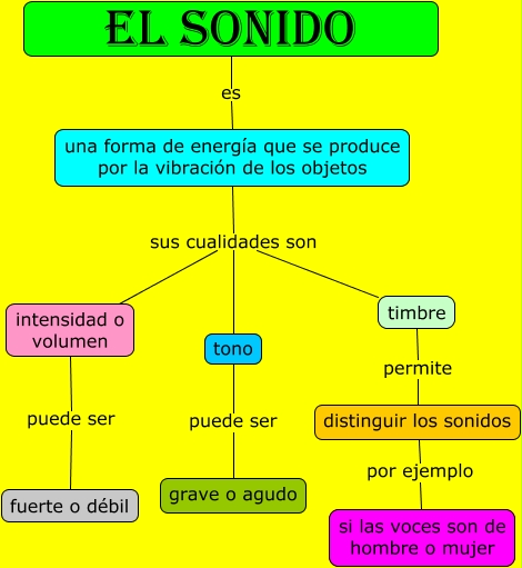 Este Cmap, tiene información relacionada con: El sonido, timbre permite distinguir los sonidos, EL SONIDO es una forma de energía que se produce por la vibración de los objetos, tono puede ser grave o agudo, una forma de energía que se produce por la vibración de los objetos sus cualidades son tono, una forma de energía que se produce por la vibración de los objetos sus cualidades son timbre, distinguir los sonidos por ejemplo si las voces son de hombre o mujer, intensidad o volumen puede ser fuerte o débil, una forma de energía que se produce por la vibración de los objetos sus cualidades son intensidad o volumen