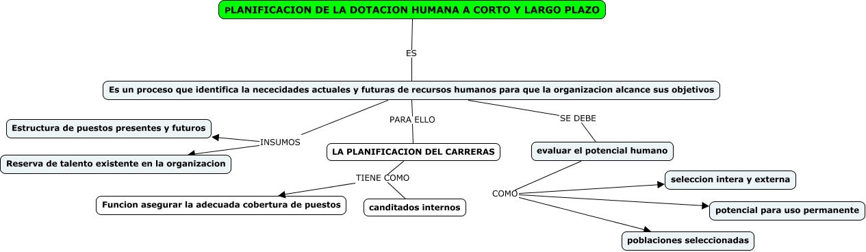 Este Cmap, tiene información relacionada con: plan. dotacion humana, Es un proceso que identifica la nececidades actuales y futuras de recursos humanos para que la organizacion alcance sus objetivos SE DEBE evaluar el potencial humano, Es un proceso que identifica la nececidades actuales y futuras de recursos humanos para que la organizacion alcance sus objetivos INSUMOS Reserva de talento existente en la organizacion, evaluar el potencial humano COMO seleccion intera y externa, evaluar el potencial humano COMO poblaciones seleccionadas, PLANIFICACION DE LA DOTACION HUMANA A CORTO Y LARGO PLAZO ES Es un proceso que identifica la nececidades actuales y futuras de recursos humanos para que la organizacion alcance sus objetivos, LA PLANIFICACION DEL CARRERAS TIENE COMO Funcion asegurar la adecuada cobertura de puestos, Es un proceso que identifica la nececidades actuales y futuras de recursos humanos para que la organizacion alcance sus objetivos PARA ELLO LA PLANIFICACION DEL CARRERAS, Es un proceso que identifica la nececidades actuales y futuras de recursos humanos para que la organizacion alcance sus objetivos INSUMOS Estructura de puestos presentes y futuros, LA PLANIFICACION DEL CARRERAS TIENE COMO canditados internos, evaluar el potencial humano COMO potencial para uso permanente