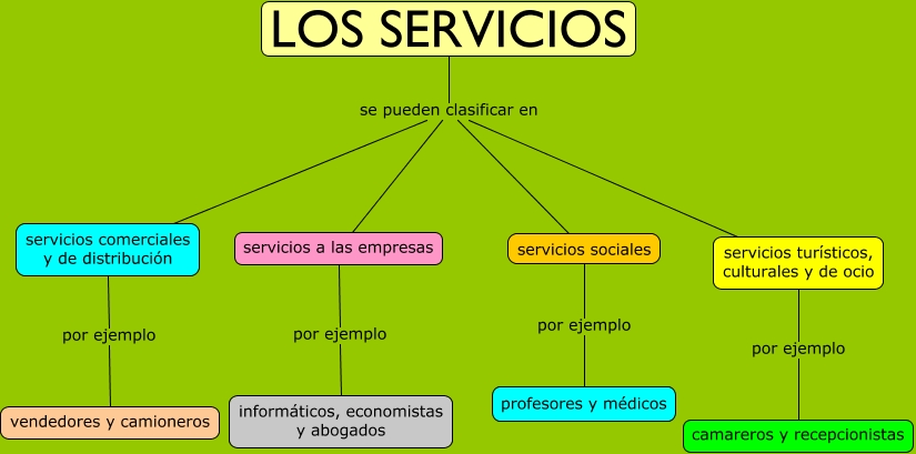 Este Cmap, tiene información relacionada con: Los servicios, servicios a las empresas por ejemplo informáticos, economistas y abogados, LOS SERVICIOS se pueden clasificar en servicios sociales, servicios turísticos, culturales y de ocio por ejemplo camareros y recepcionistas, servicios comerciales y de distribución por ejemplo vendedores y camioneros, LOS SERVICIOS se pueden clasificar en servicios comerciales y de distribución, LOS SERVICIOS se pueden clasificar en servicios turísticos, culturales y de ocio, LOS SERVICIOS se pueden clasificar en servicios a las empresas, servicios sociales por ejemplo profesores y médicos