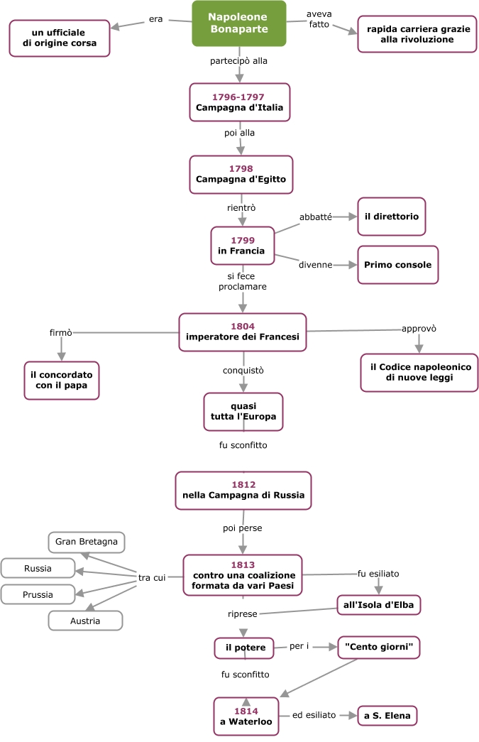 Questa Cmap, creata con IHMC CmapTools, contiene informazioni relative a: Napoleone, Napoleone Bonaparte era un ufficiale di origine corsa, 1796-1797 Campagna d'Italia poi alla 1798 Campagna d'Egitto, 1804 imperatore dei Francesi firmò il concordato con il papa, 1813 contro una coalizione formata da vari Paesi tra cui Russia, 1813 contro una coalizione formata da vari Paesi tra cui Gran Bretagna, il potere per i "Cento giorni", Napoleone Bonaparte aveva fatto rapida carriera grazie alla rivoluzione, 1799 in Francia divenne Primo console, 1799 in Francia si fece proclamare 1804 imperatore dei Francesi, 1804 imperatore dei Francesi approvò il Codice napoleonico di nuove leggi, quasi tutta l'Europa fu sconfitto 1812 nella Campagna di Russia, 1813 contro una coalizione formata da vari Paesi fu esiliato all'Isola d'Elba, il potere fu sconfitto 1814 a Waterloo, 1813 contro una coalizione formata da vari Paesi riprese il potere, 1813 contro una coalizione formata da vari Paesi tra cui Austria, 1798 Campagna d'Egitto rientrò 1799 in Francia, Napoleone Bonaparte partecipò alla 1796-1797 Campagna d'Italia, 1799 in Francia abbatté il direttorio, 1804 imperatore dei Francesi conquistò quasi tutta l'Europa, 1812 nella Campagna di Russia poi perse 1813 contro una coalizione formata da vari Paesi