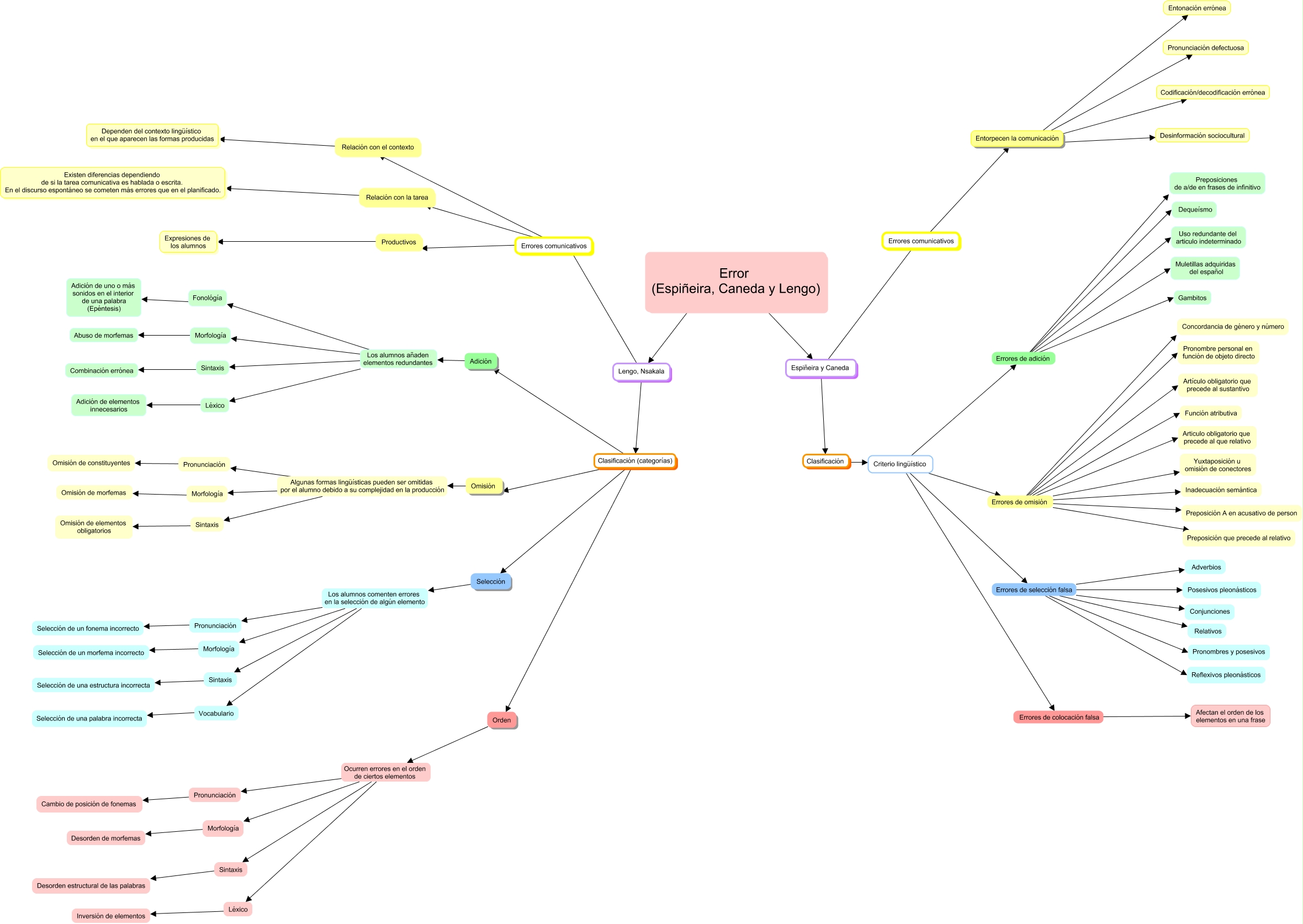 Este Cmap, tiene información relacionada con: Comparacion esquemas, Pronunciación Selección de un fonema incorrecto, Criterio lingüístico Errores de omisión Artículo obligatorio que precede al sustantivo, Errores comunicativos ???? Productivos, Lengo, Nsakala Clasificación (categorías) Selección, Criterio lingüístico Errores de omisión Función atributiva, Léxico ???? Inversión de elementos, Lengo, Nsakala Clasificación (categorías) Orden, Omisión Algunas formas lingüísticas pueden ser omitidas por el alumno debido a su complejidad en la producción Morfología, Morfología Abuso de morfemas, Criterio lingüístico Errores de omisión Inadecuación semántica, Criterio lingüístico Errores de omisión Pronombre personal en función de objeto directo, Espiñeira y Caneda ???? Errores comunicativos, Selección Los alumnos comenten errores en la selección de algún elemento Pronunciación, Fonológía Adición de uno o más sonidos en el interior de una palabra (Epéntesis), Pronunciación ???? Omisión de constituyentes, Criterio lingüístico Errores de omisión Preposición A en acusativo de person, Entorpecen la comunicación Desinformación sociocultural, Criterio lingüístico Errores de selección falsa Reflexivos pleonásticos, Criterio lingüístico Errores de omisión Articulo obligatorio que precede al que relativo, Criterio lingüístico Errores de selección falsa Adverbios