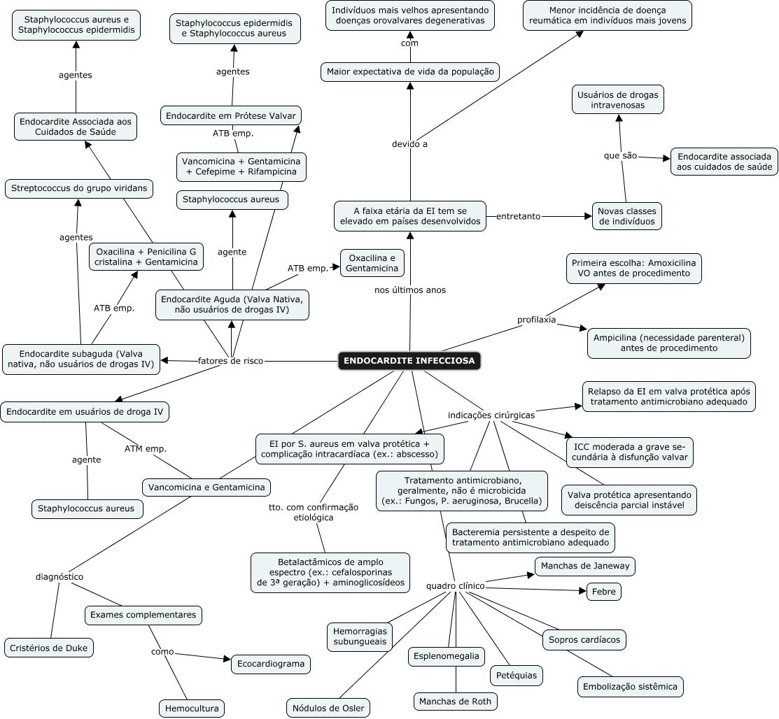 Esse mapa conceitual, produzido no IHMC CmapTools, tem a informação relacionada a: Endocardite Infecciosa - 2º caso, ENDOCARDITE INFECCIOSA fatores de risco Endocardite Associada aos Cuidados de Saúde, ENDOCARDITE INFECCIOSA quadro clínico Febre, ENDOCARDITE INFECCIOSA quadro clínico Hemorragias subungueais, ENDOCARDITE INFECCIOSA tto. com confirmação etiológica Betalactâmicos de amplo espectro (ex.: cefalosporinas de 3ª geração) + aminoglicosídeos, ENDOCARDITE INFECCIOSA fatores de risco Endocardite Aguda (Valva Nativa, não usuários de drogas IV), Endocardite Aguda (Valva Nativa, não usuários de drogas IV) agente Staphylococcus aureus, Maior expectativa de vida da população com Indivíduos mais velhos apresentando doenças orovalvares degenerativas, Endocardite subaguda (Valva nativa, não usuários de drogas IV) ATB emp. Oxacilina + Penicilina G cristalina + Gentamicina, ENDOCARDITE INFECCIOSA indicações cirúrgicas ICC moderada a grave se- cundária à disfunção valvar, Exames complementares como Ecocardiograma, Endocardite em Prótese Valvar ATB emp. Vancomicina + Gentamicina + Cefepime + Rifampicina, ENDOCARDITE INFECCIOSA quadro clínico Manchas de Janeway, ENDOCARDITE INFECCIOSA quadro clínico Petéquias, ENDOCARDITE INFECCIOSA quadro clínico Manchas de Roth, ENDOCARDITE INFECCIOSA profilaxia Primeira escolha: Amoxicilina VO antes de procedimento, A faixa etária da EI tem se elevado em países desenvolvidos devido a Maior expectativa de vida da população, ENDOCARDITE INFECCIOSA indicações cirúrgicas Relapso da EI em valva protética após tratamento antimicrobiano adequado, A faixa etária da EI tem se elevado em países desenvolvidos entretanto Novas classes de indivíduos, ENDOCARDITE INFECCIOSA quadro clínico Esplenomegalia, ENDOCARDITE INFECCIOSA indicações cirúrgicas Tratamento antimicrobiano, geralmente, não é microbicida (ex.: Fungos, P. aeruginosa, Brucella)