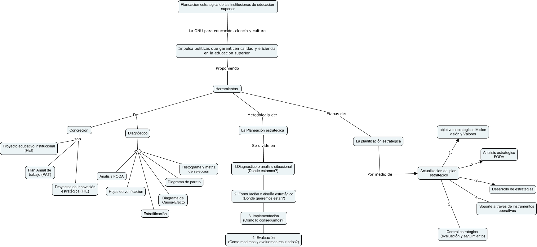 Este Cmap, tiene información relacionada con: Planeación estrategica de instituciones de educación superior Grupo 4, Actualización del plan estrategico 2. Analisis estrategico FODA, Herramientas De: Concreción, Diagnóstico Son Diagrama de Causa-Efecto, Actualización del plan estrategico 1. objetivos esrategicos,Misión visión y Valores, Diagnóstico Son Diagrama de pareto, Diagnóstico Son Análisis FODA, La Planeación estrategica Se divide en 2. Formulación o diseño estratégico (Donde queremos estar?), Concreción son Proyecto educativo institucional (PEI), Concreción son Proyectos de innovación estratégica (PIE), Planeación estrategica de las instituciones de educación superior La ONU para educación, ciencia y cultura Impulsa politicas que garanticen calidad y eficiencia en la educación superior, La planificación estrategica Por medio de Actualización del plan estrategico, Concreción son Plan Anual de trabajo (PAT), Actualización del plan estrategico 4. Soporte a través de instrumentos operativos, Diagnóstico Son Hojas de verificación, Herramientas Etapas de: La planificación estrategica, Diagnóstico Son Histograma y matriz de selección, Actualización del plan estrategico 5. Control estrategico (evaluación y seguimiento), Herramientas De: Diagnóstico, La Planeación estrategica Se divide en 1.Diagnóstico o análisis situacional (Donde estamos?), Diagnóstico Son Estratificación